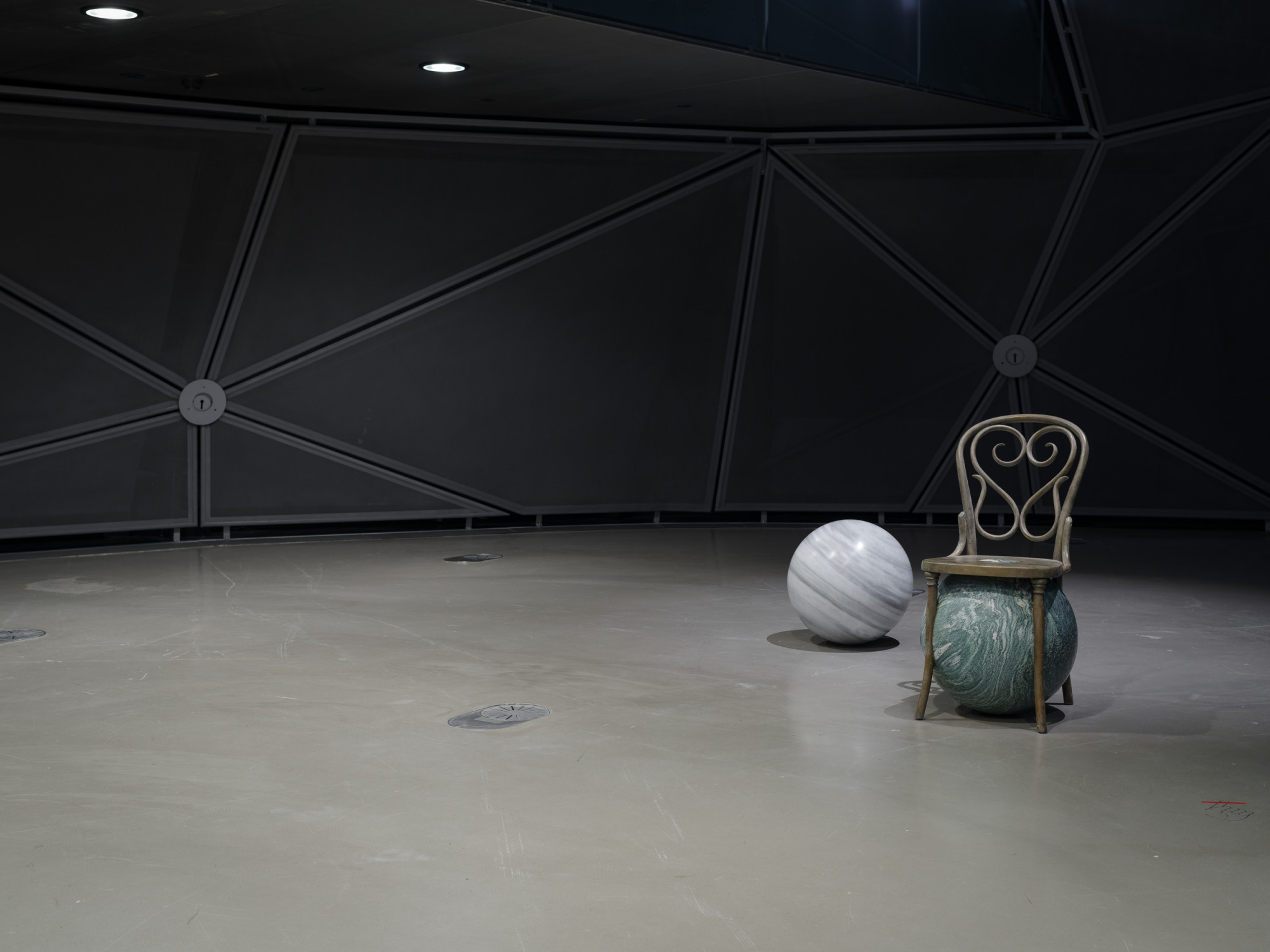 In "Siège du Monde II", stones that are millions of years old are cut and polished into precise spheres and become the image of the ‘Blue Marble’, the Earth seen from space. If, however, a chair sits on top of the sphere, a chair like at the kitchen table at home, and if this is made of bronze, it suggests the weight of the culture of humankind pressing down on the planet, and who dares to sit on it. Kwade’s sculptures of stone and bronze, or a mirrored clock, are like interpretative orders of scientific experi ments. What is time without its humanmade structure?