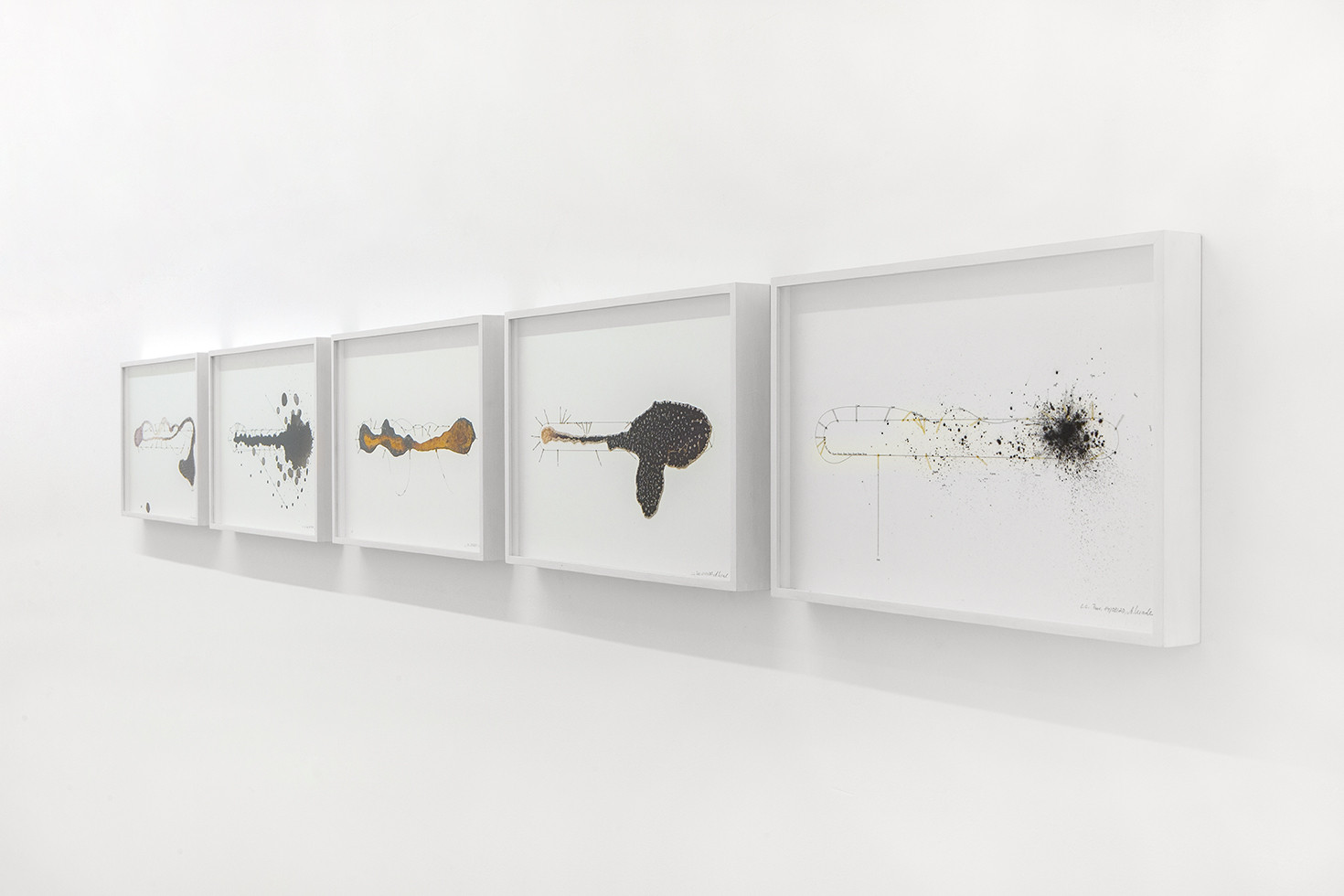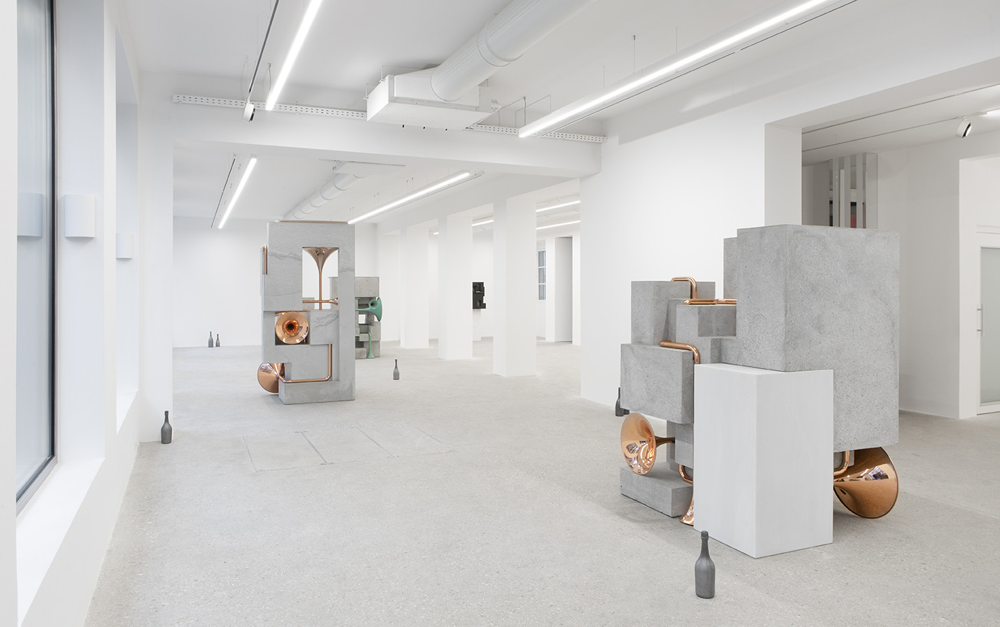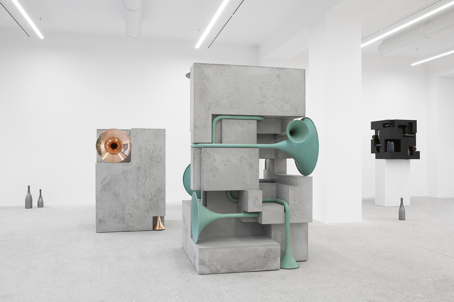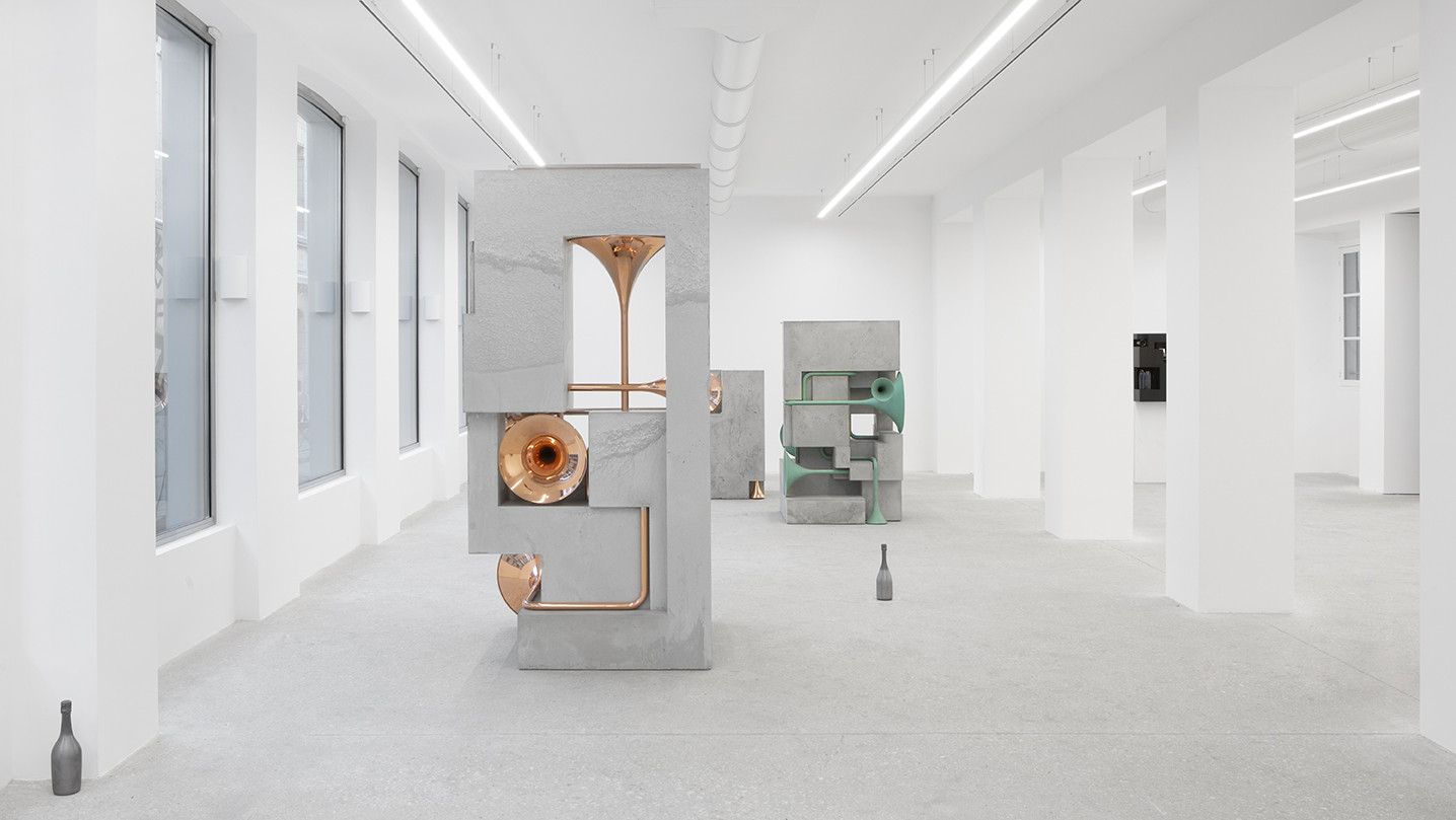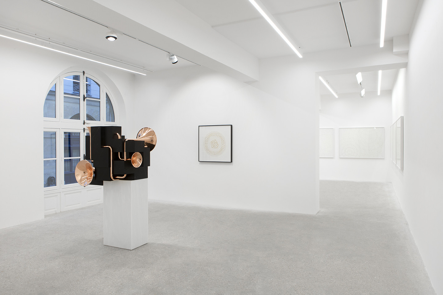 Time and space are likewise summoned up in Kwade's sculptures, which combine improbable funnels with interlocking geometrical modules. One might be tempted to establish a shared genealogy for the two, except that their interlocking reveals no prior history and it is highly probable that, as in a symbiotic entity, a common growth has sealed their evolution. In any case, the copper funnels trace vectors defining a three-dimensional reality and, of course, evoke instruments which are creating music through the vibration of their resonant bodies.