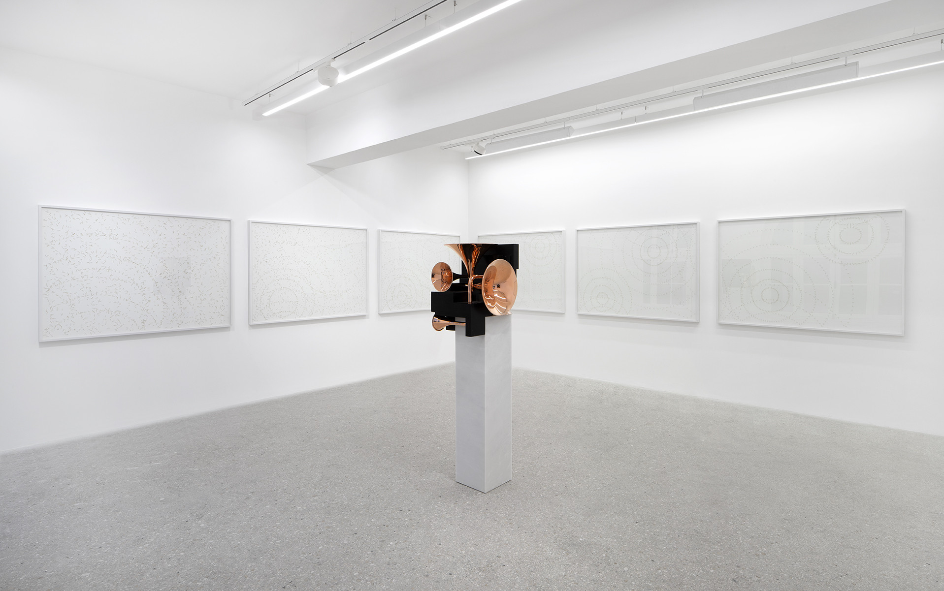 Time, space and the concept of reality are notions inseparably linked to Alicja Kwade's universe, and this since she began a career characterised by the disposition of elements either simple or lending themselves to greater complexities: laid out on the floor, suspended from the ceiling, embracing a third dimension or starkly on show, hanging on the wall. What these components offer the eye is a physical reality generated by a process of transmutation. A sort of alchemy nonetheless free of any mystical ambitions. Anxious to maintain a link with prosaic things, Kwade strives for a visible traceability with the objects or motifs, often close to hand, as well as with the materials (like gold, lead, copper) on which she has set her sights.