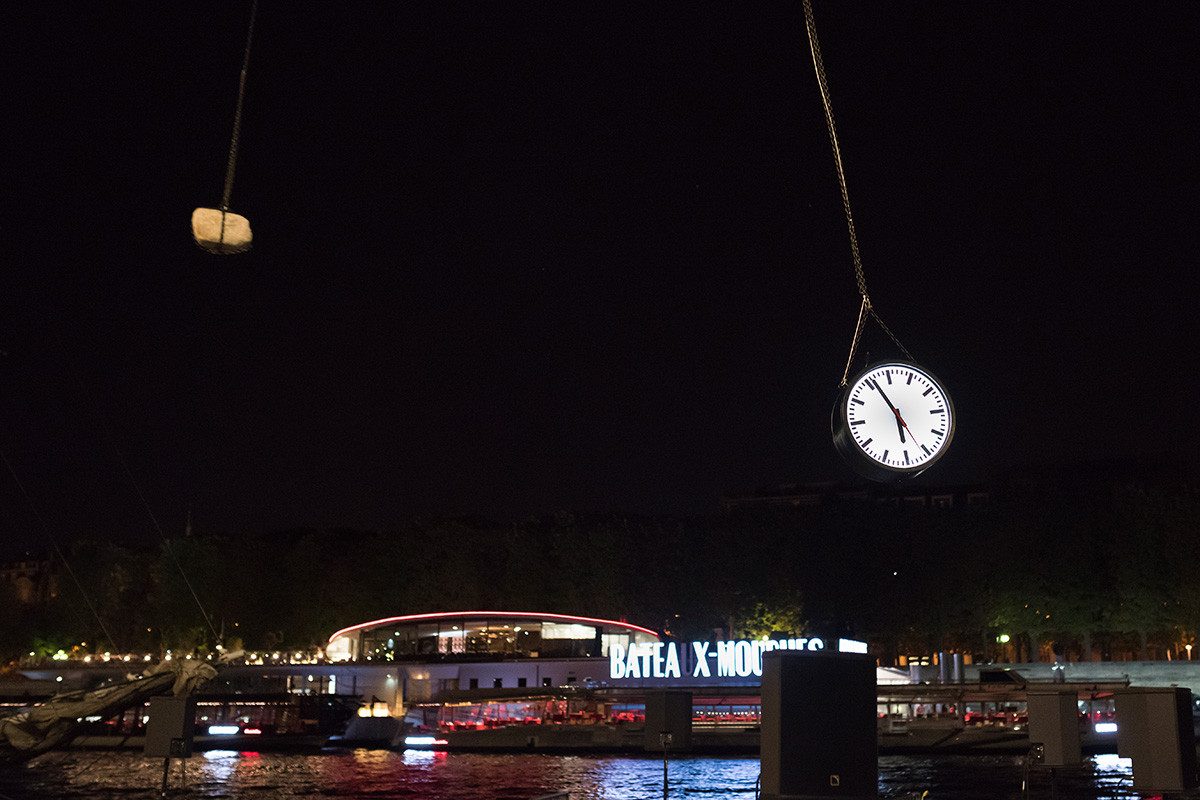 ~ Tick tock, tick tock ... ~ The time of Poliphile seems to have arrived. An imposing suspended clock swings like a sword Damocles over the head of the visitors. Driven by gravitational and centrifugal forces, the pendulum and the stone that serves as a counterweight perform a choregraphy set at a constant speed. As Foucault's pendulum whose swing evinces the rotation of the Earth, the installation shows the movement of time as that of the world. A recurrent motif of the artist's work, the clock is a testament to the human impulse to measure and divide time as a means for controlling and shaping reality.