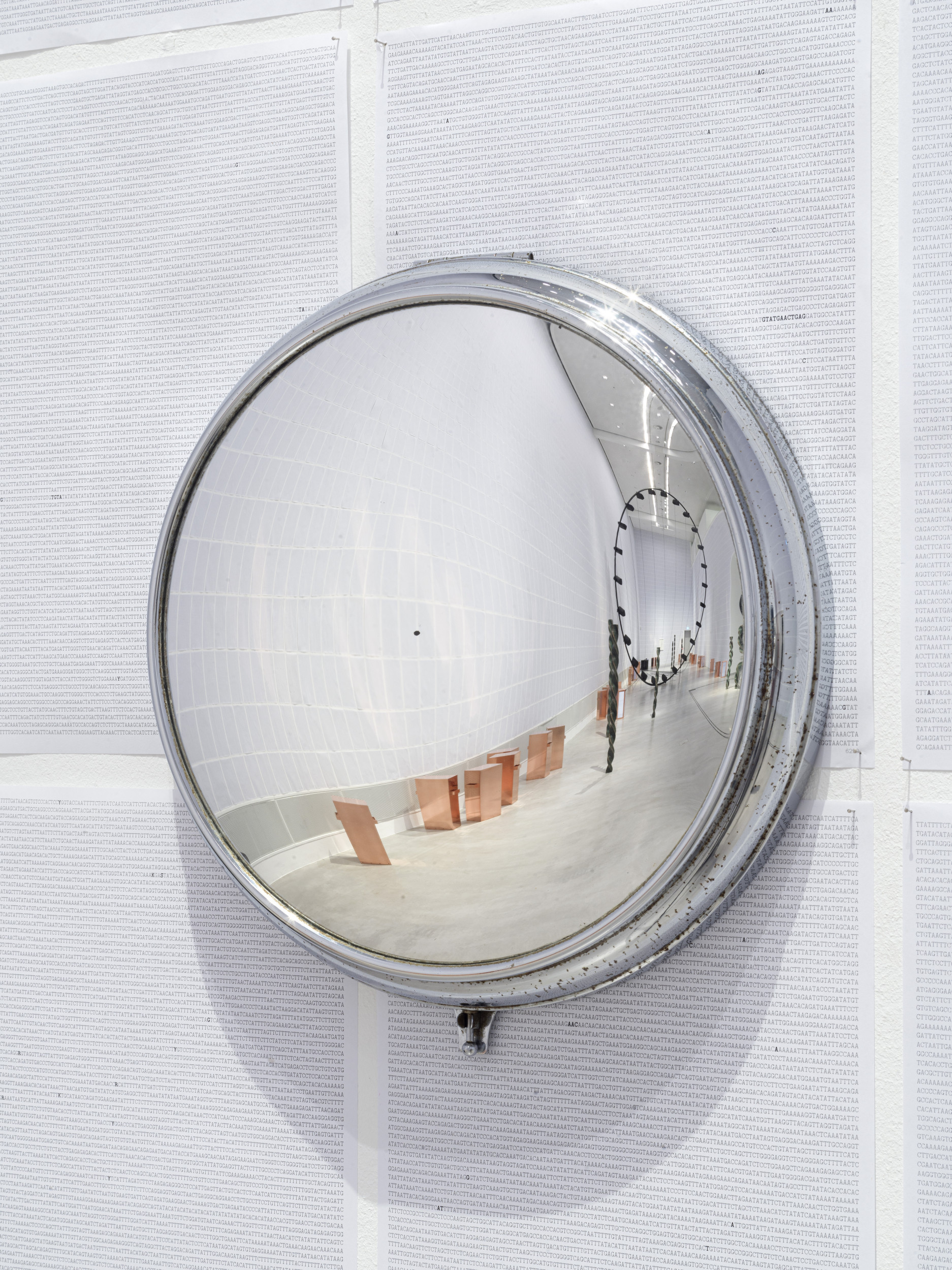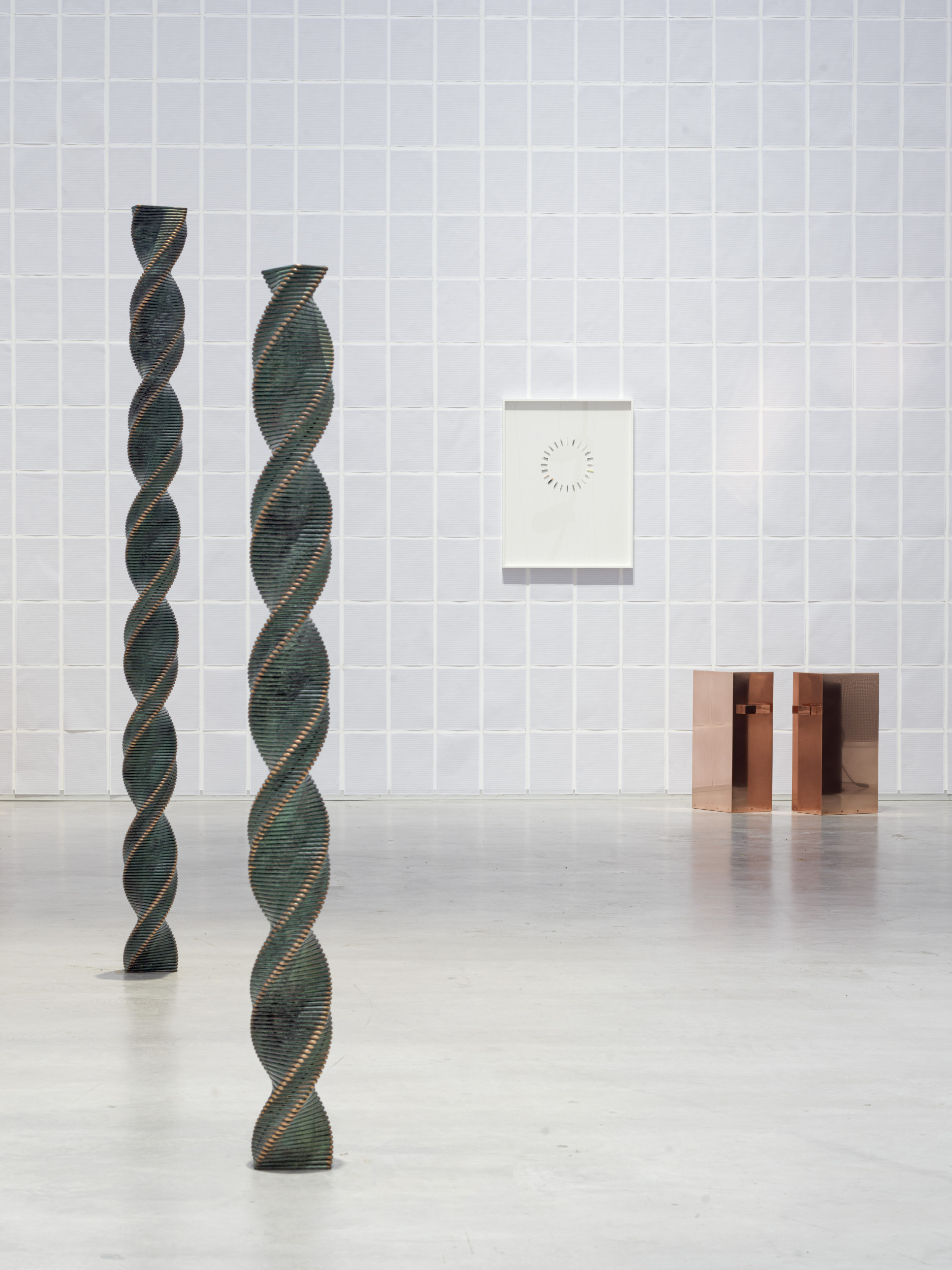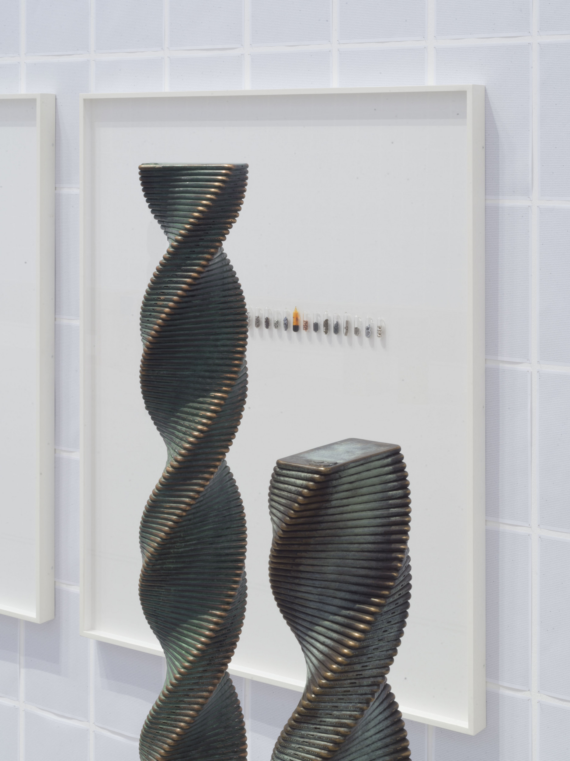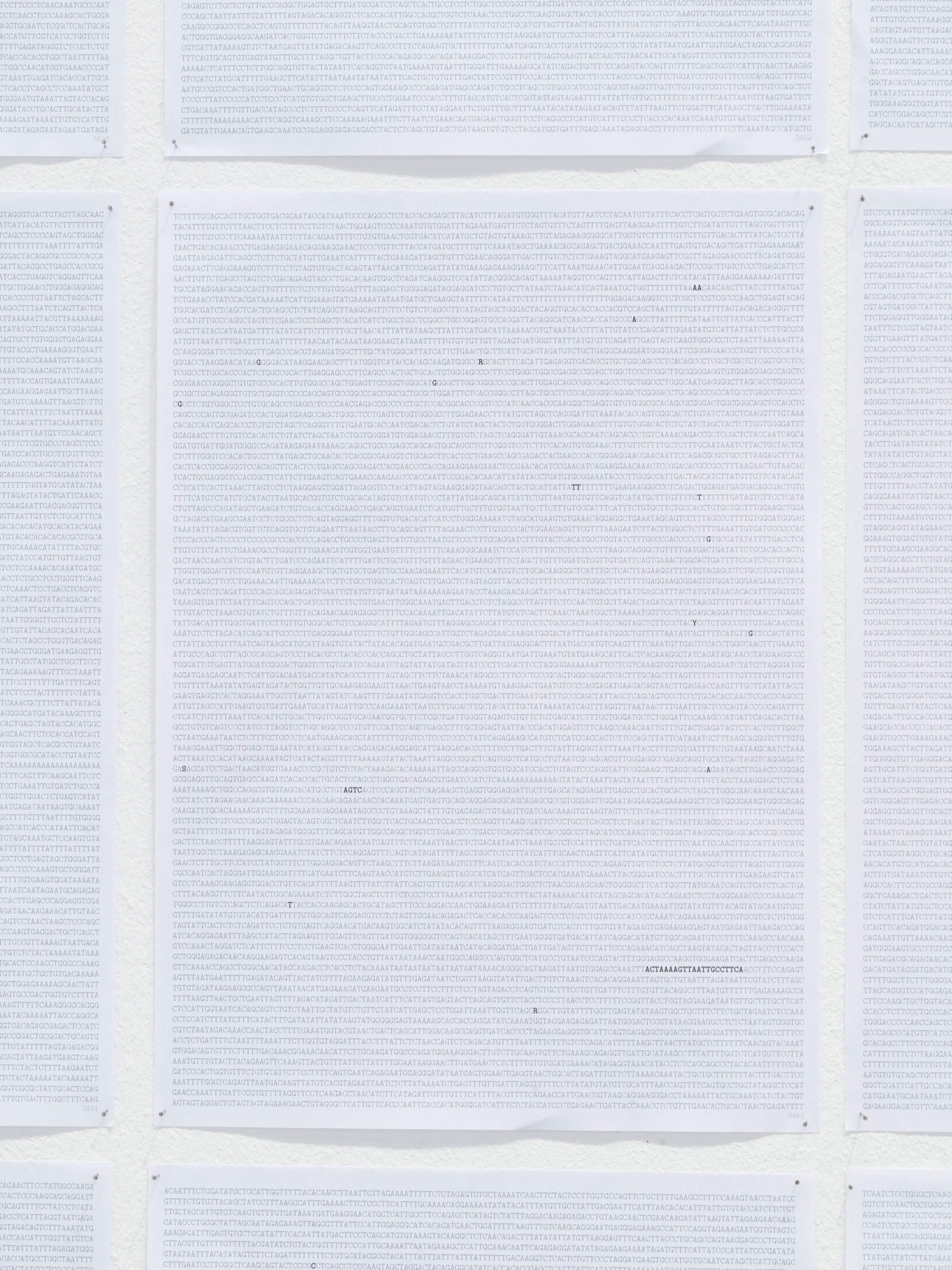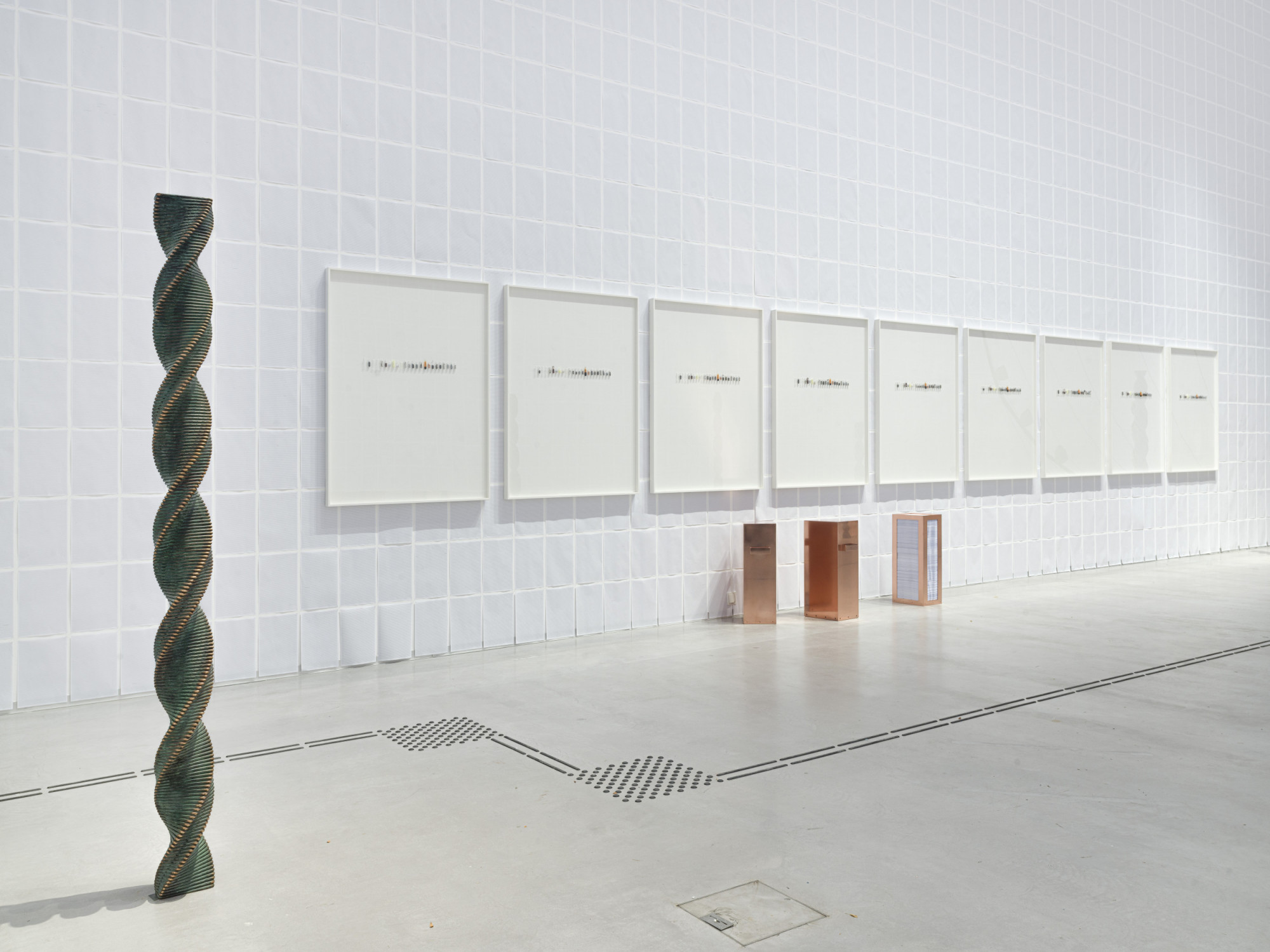 The work “Self-Portrait” consists of 24 glass ampoules containing, in pure form, the chemical elements that make up the human body. There is a large installation based on the artist’s fully sequenced DNA, printed out on 314,000 pages of paper. The human genome in the digital era is also the theme of the bronze stelae: here the artist has shaped numerous overlapping smartphones into a double helix.