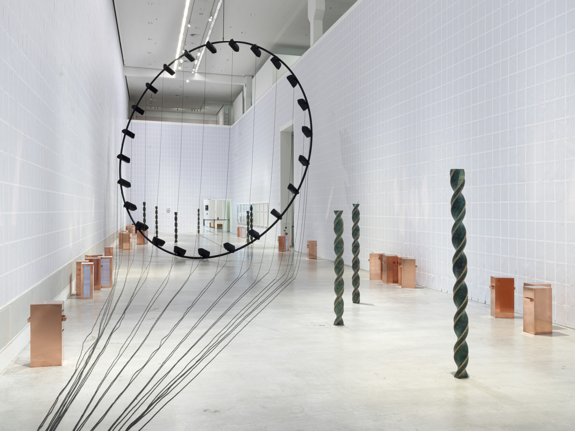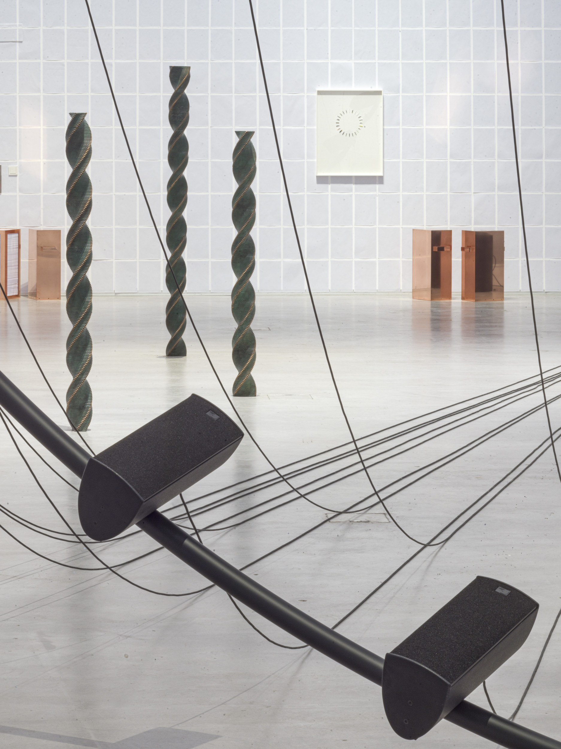 The central piece locates an individual physically in time and space. A ring of black steel in the middle of the hall reaches almost to the ceiling. 24 loudspeakers have been mounted on it and transmit the artist’s heartbeat into the exhibition room.