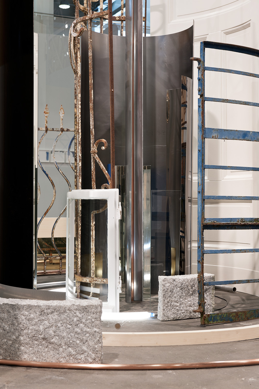 wood, copper, brass, glass, aluminium, granite, steel, mirror, bronze, MDF, neon tube, found objects, 70 parts