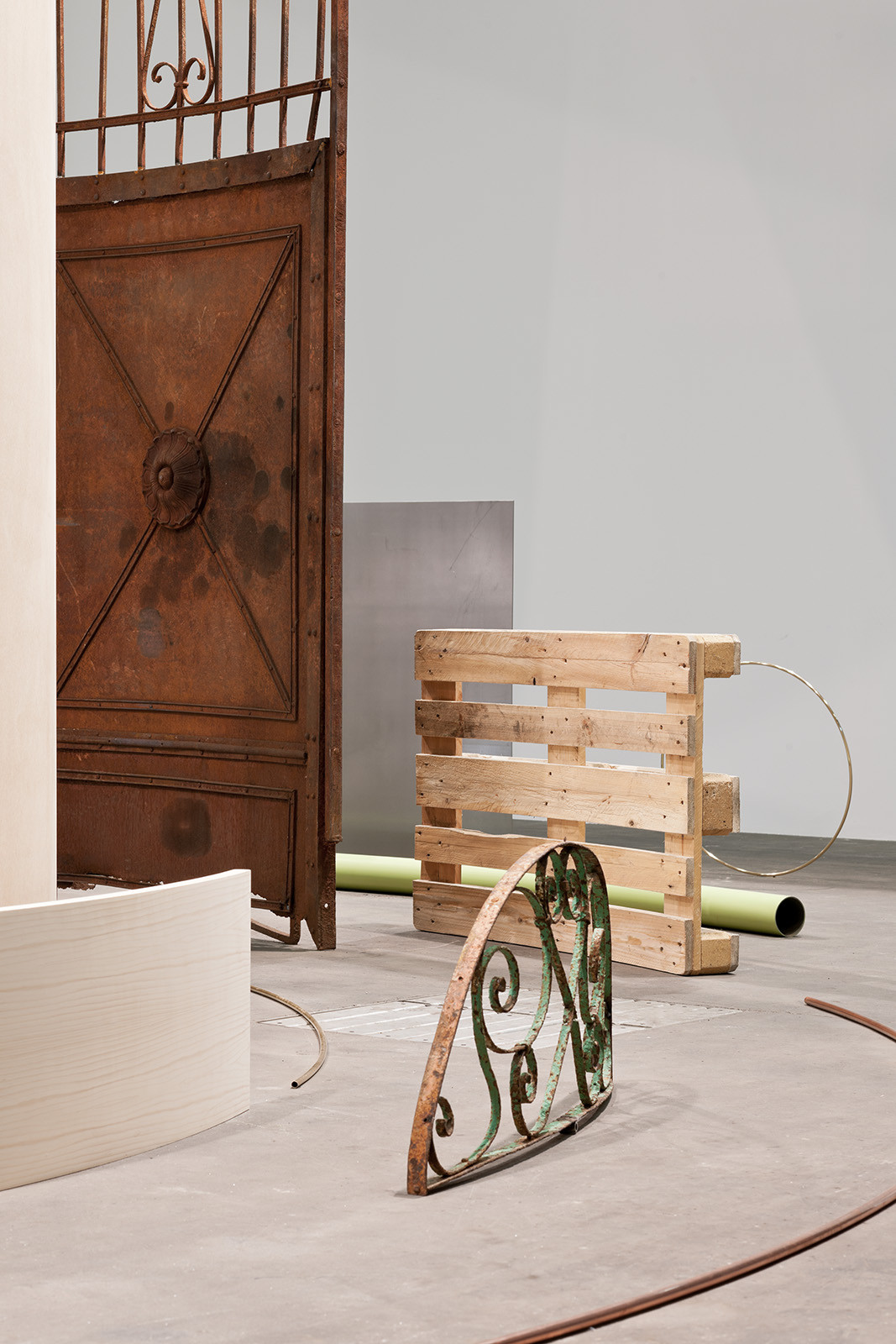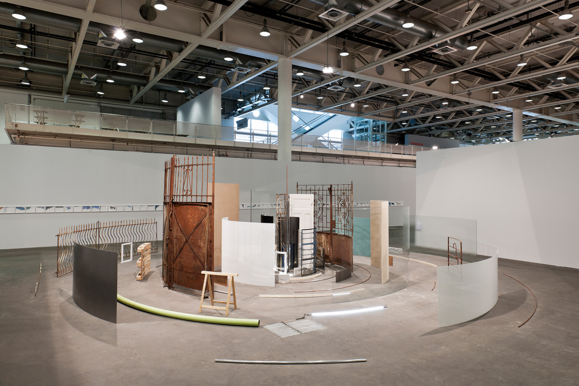 "In Circles" might represent the neck of a "closed country" in which everything is arranged in circular paths leading into equally distant spaces around the center. Bicycles, doors, windows, iron gates and metal plates or a 2-Euro coin are not only limited to the circular orbits, but have exactly adopted the curvature, arising from the removal of the respective centralized path. Many of Kwade's objects and installations seem to embrace scientific theories or musings: phenomena and laws of the micro- or macro-world can be exemplified by comparison with our everyday environment.