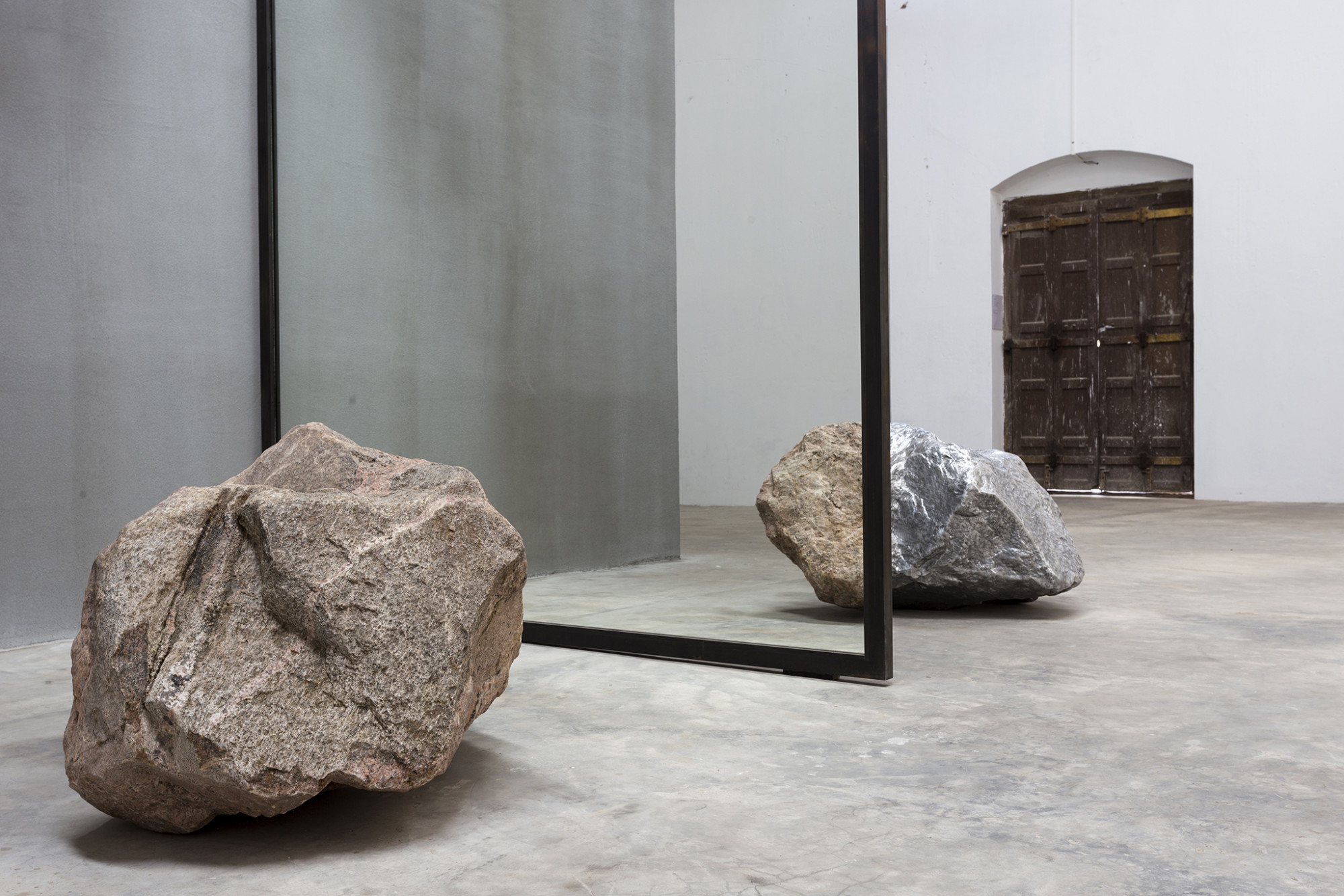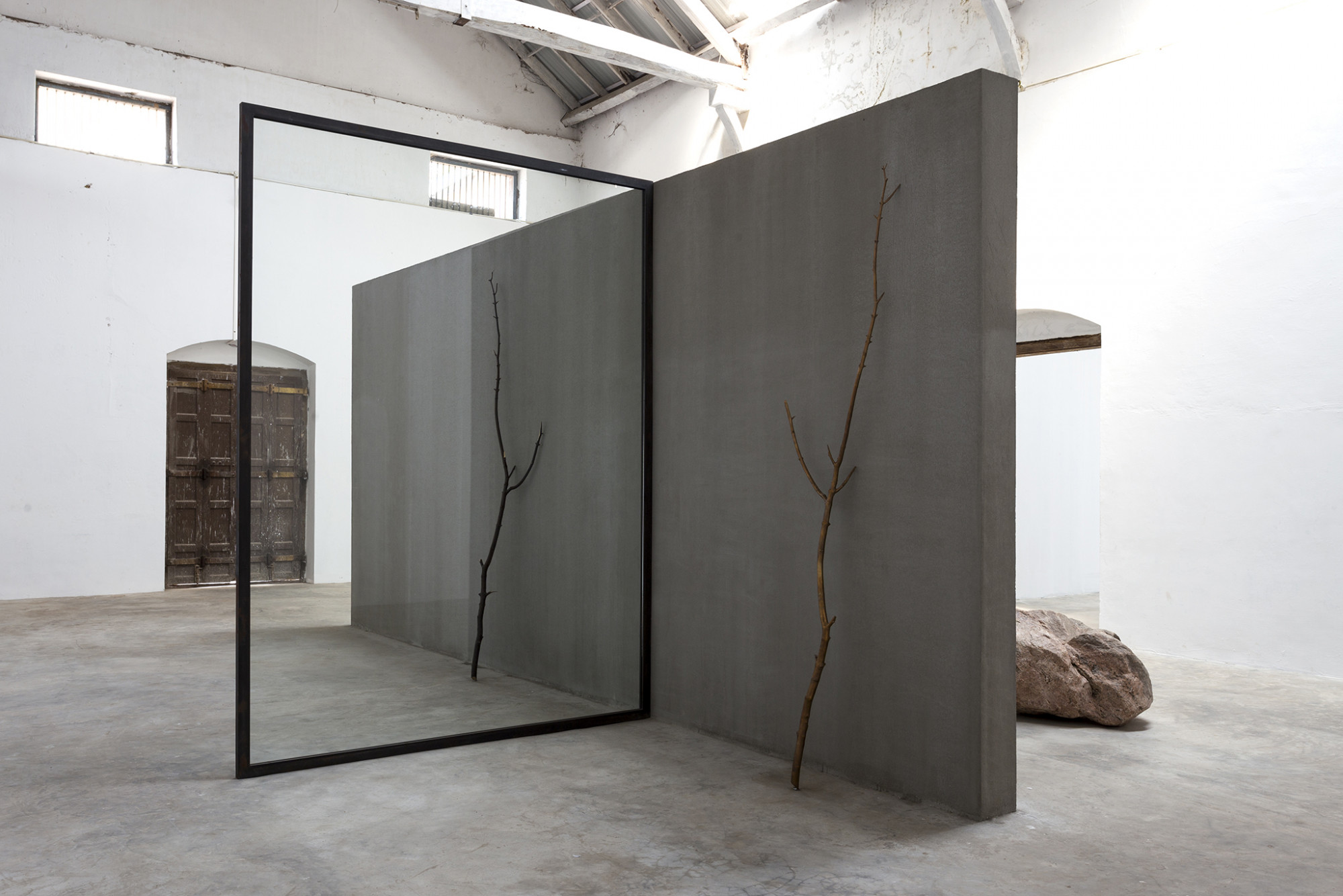 In Out of Ousia, Alicja Kwade creates a sculptural environment that extends the limits of observable reality. A structure composed of a two-sided concrete wall, a double mirror, and a large piece of glass chart out distinct perceptual spaces that coexist but cannot be entered simultaneously. Within these refractory environments, a found branch leans on one side of the installed concrete wall, while an exact copy of the branch made of corten steel leans opposite. In another face-off, a boulder is placed on the floor against a mirrored wall; its inverted double in aluminum peers back through the other side, the replica encroaching on the original’s impermeable reality.