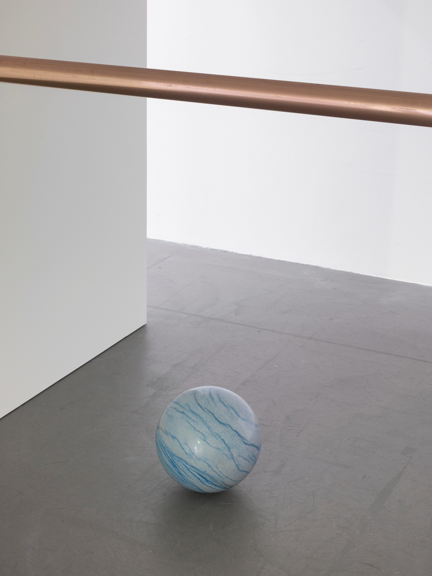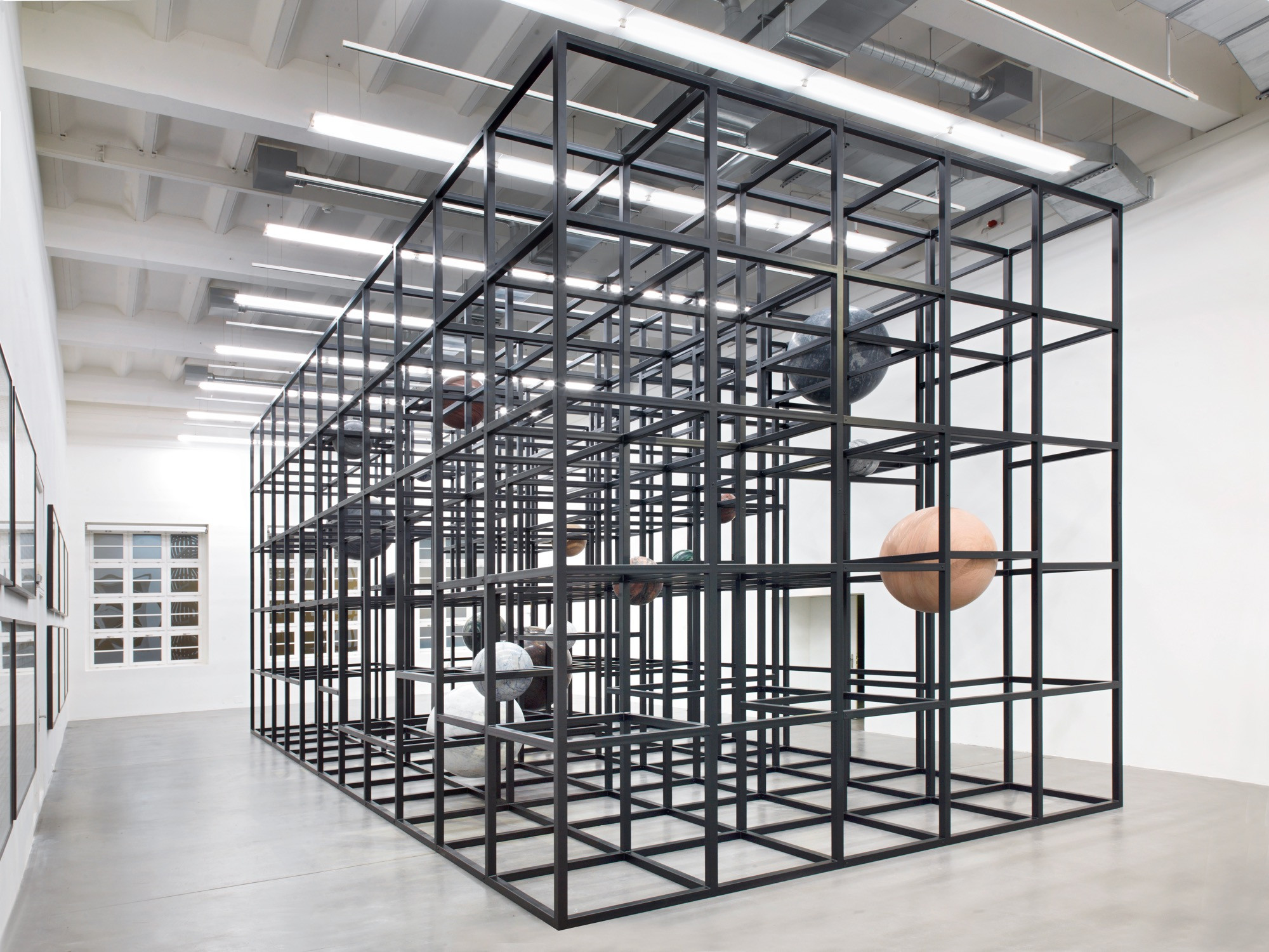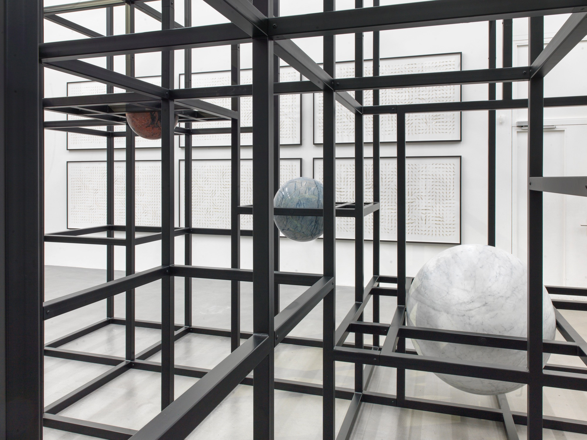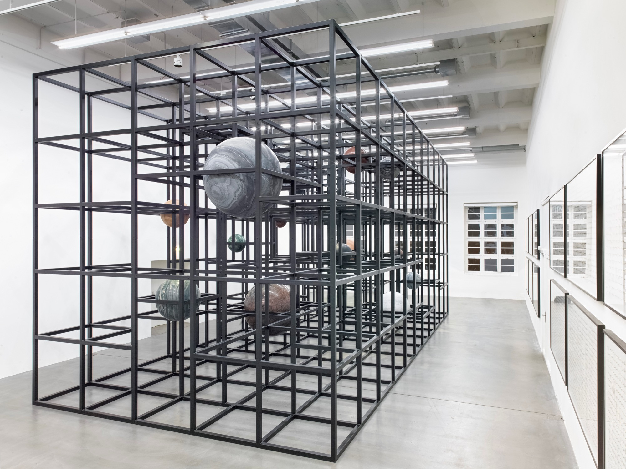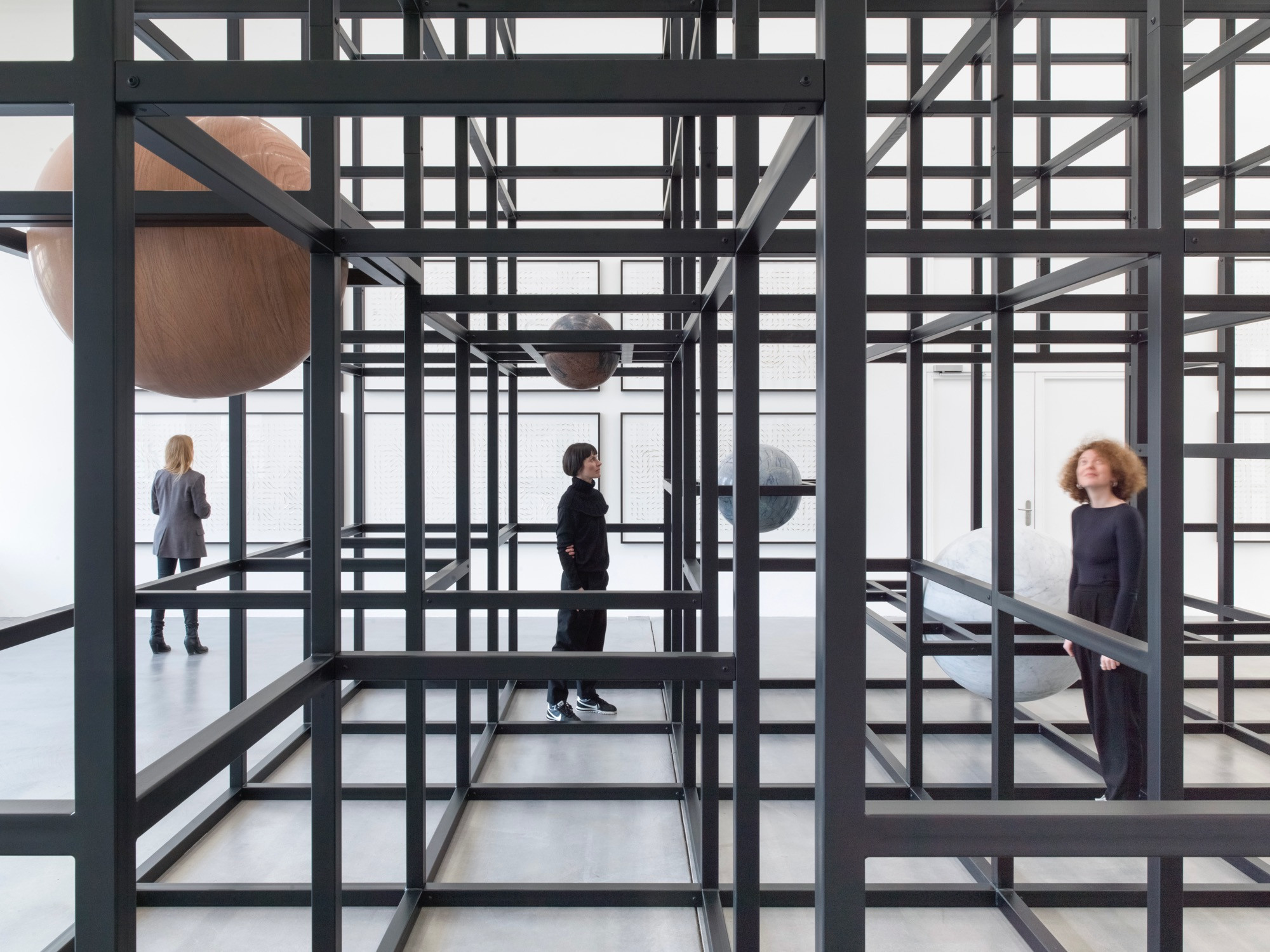 For the exhibition at Museum Haus Konstruktiv, which extends over three floors, Alicja Kwade has conceived the new, extensive installation LinienLand (LineLand): a walk-through three-dimensional grid structure, in which differently sized solid spheres of natural stone float in apparent weightlessness. Here, the artist refers to the idea of parallel worlds, which has been the subject of much discussion since antiquity. Against this backdrop, the extensive structure, based on a system of 5 x 5 x 11 squares, is to be read as a multiverse, whereby each individual cubic metal boundary implies a distinct reality. The grid’s steel system correlates with the stones: Kwade adheres to a strict self-imposed principle, according to which, via the shifting within the system, the individual bars form the spheres’ supports. The resulting gateways invite the visitors to enter a multiverse and to experience the gravity of the large stone spheres, which bring to mind a gravitational field. The natural stones come from the various continents of our Earth and also symbolize them. The stone material itself, with its various layers that have formed over several million years and make it possible to determine its age, acts as a kind of timescale. In LinienLand, Alicja Kwade has managed to implement her thoughts on space, gravity and time in a fascinating way.