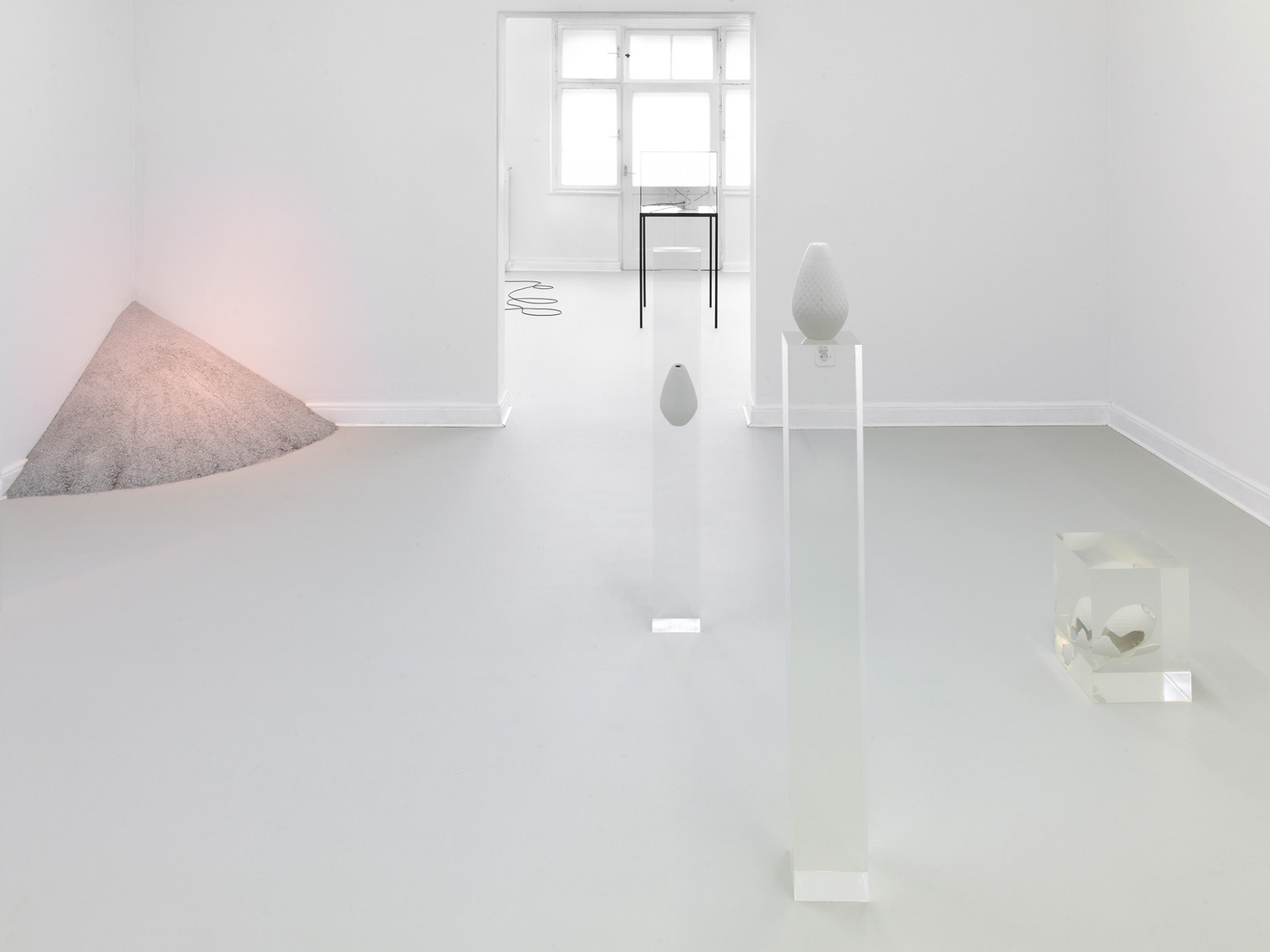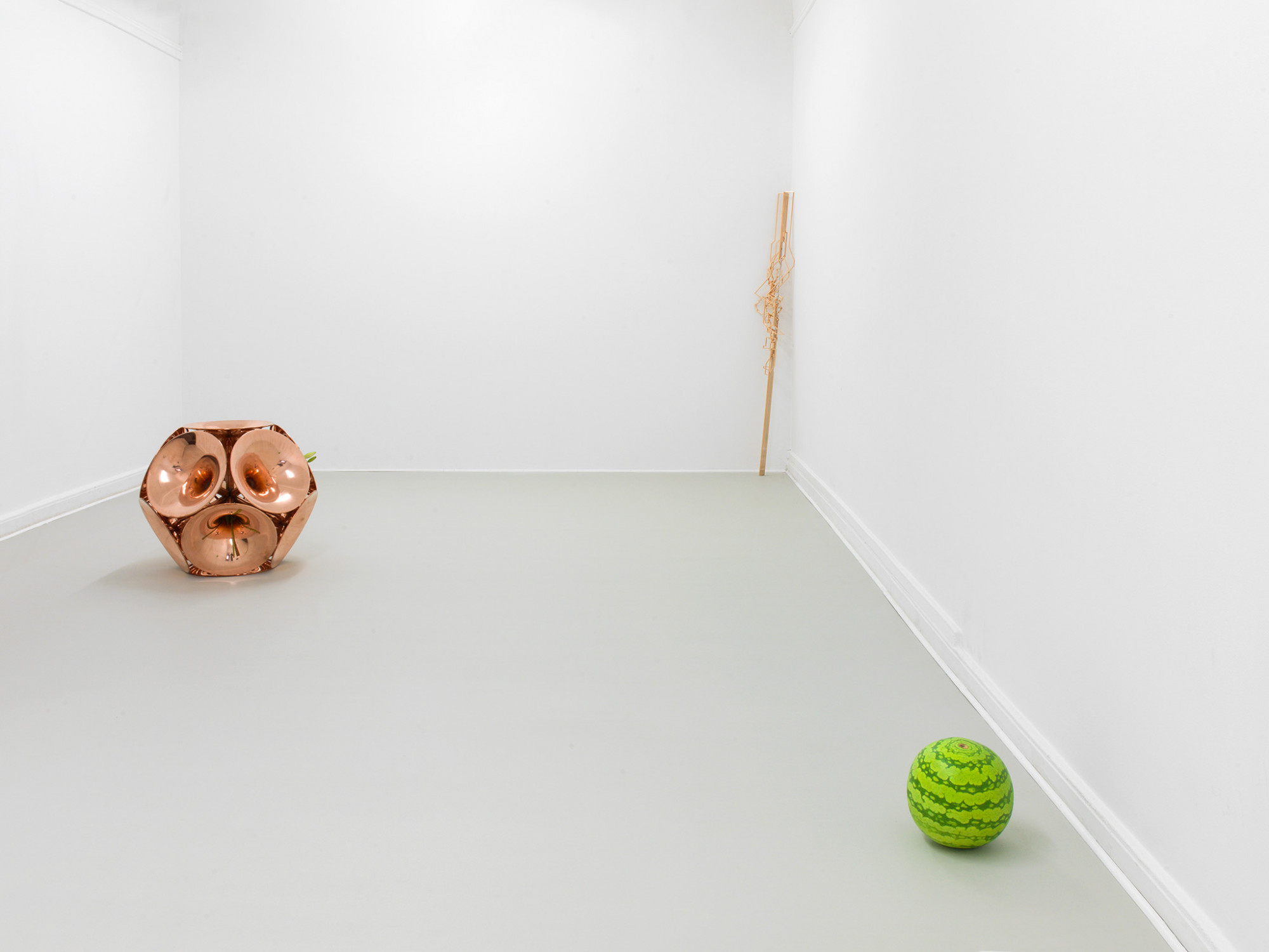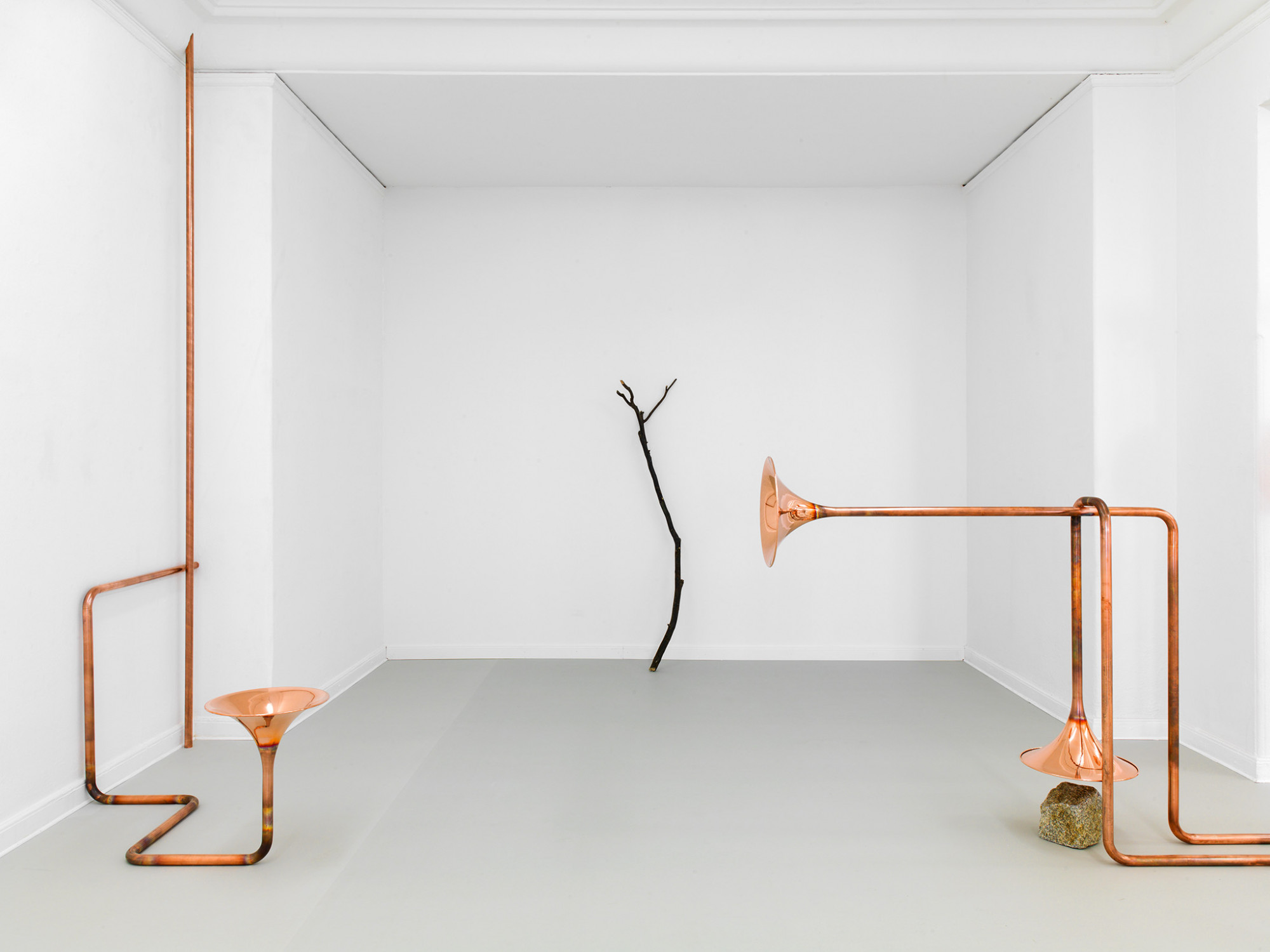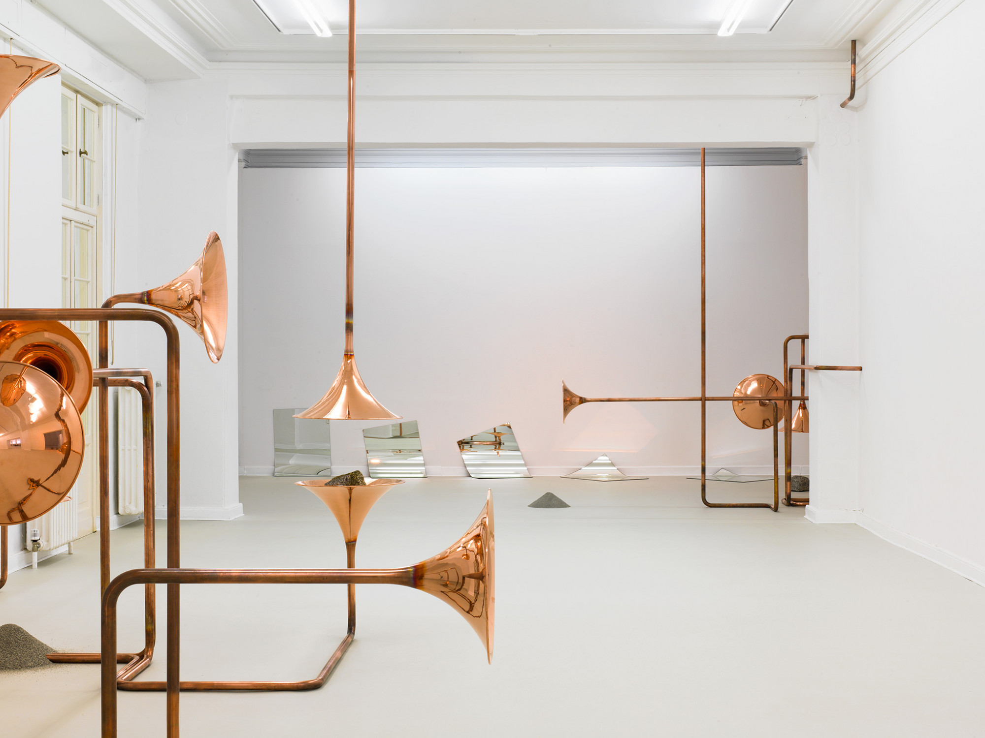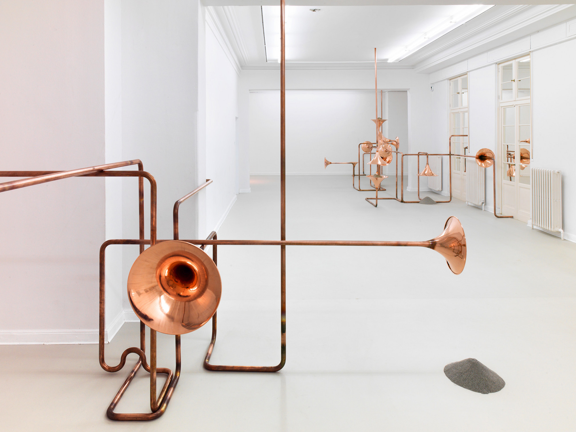 Hypothetisches Gebilde II–IV (2015) What we see is a system of copper piping with trumpet-shaped openings, of which only segments can be seen from the various vantage points. In places, the piping vanishes under heaps of sand. By running the piping system into every spatial direction Alicja Kwade renders it incomprehensible. Starting from scientific illustrations of wormhole theories, she works with a material very familiar from everyday use. She adds granite as a sign of time and transience, which, in shapes from hard chunks to ground heaps, emerge in various aggregation states and varying dimensions. Everything seems to be connected to everything.
