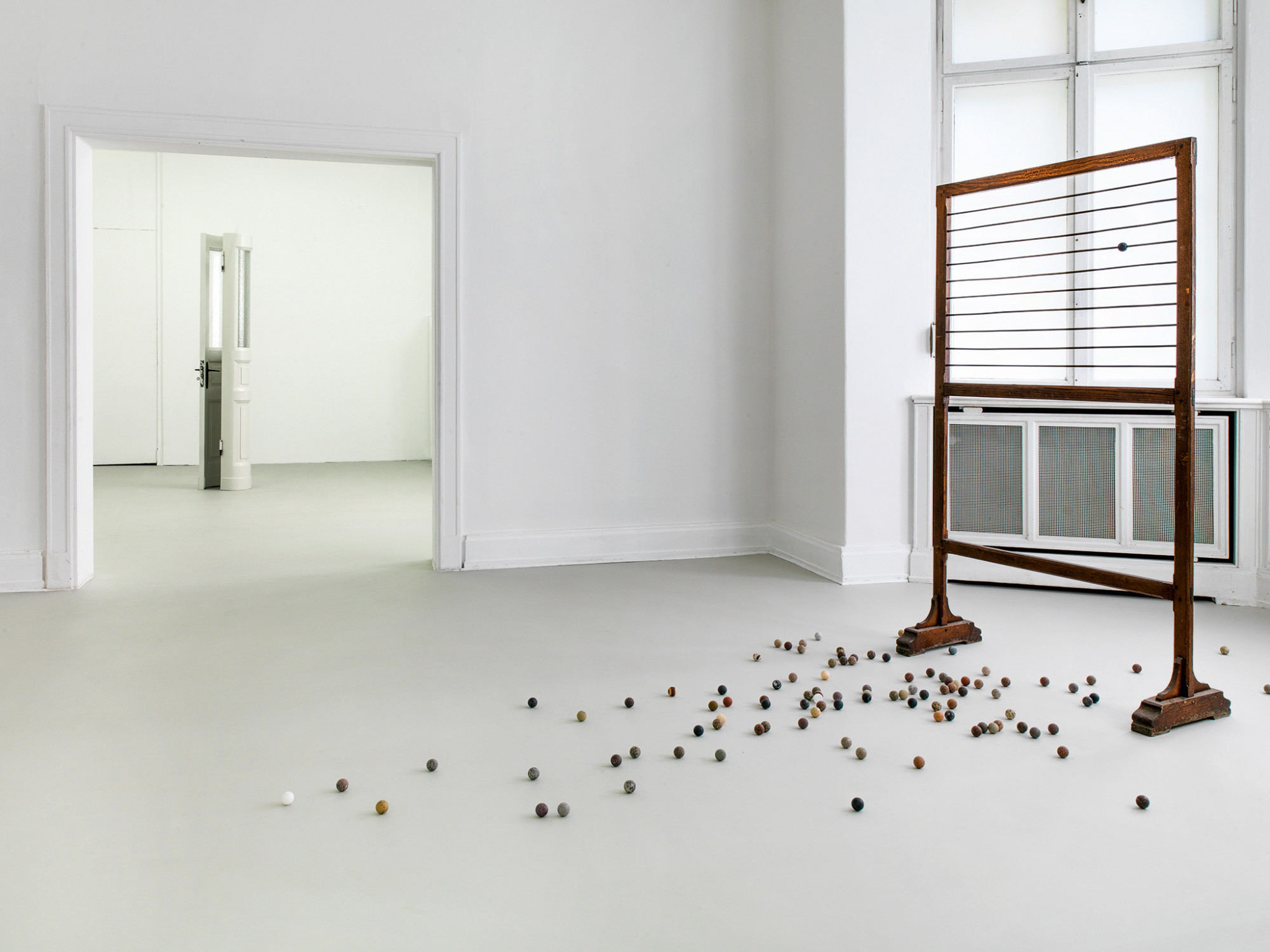 An old abacus is carrying only one bead whilst all others are scattered around the floor. Unlike other traditional beads, they aren’t made out of glass or wood, they are also lacking the needed holes which are essential so the bead can be fixed on the wires of the abacus. Those beads are found stones which have been cut into a perfect round shape. The calculator tool seems worthless as for its flawed elements and it can’t help defining the cultural value of things and the question arises of the arbitrariness of valuation.