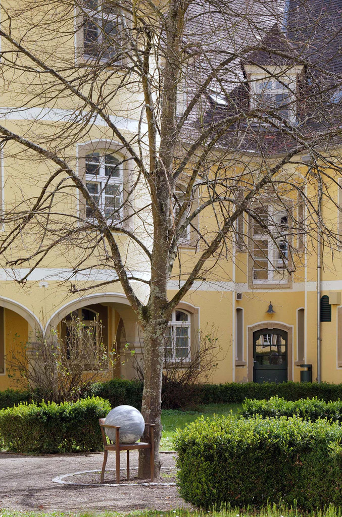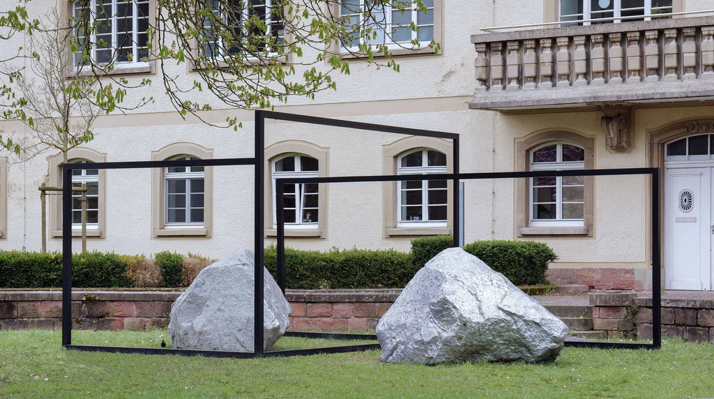 Additionally, Kwade has chosen to include two other multi-part sculptures for the park – BIG BE-HIDE, 2022 and WÄCHTER (ANSCHAUUNGSVORSTELLUNG), 2013 – as well as SIÈGE DU MONDE, 2022, featuring a marble sphere nestled within the seat of a wicker chair. BIG BE-HIDE is made of steel frames set at right angles to one another with a two-sided mirror and granite boulder placed at the nexus of the frames’ conjunction, effectively doubling both the objects contained within the sculpture and the context surrounding it.