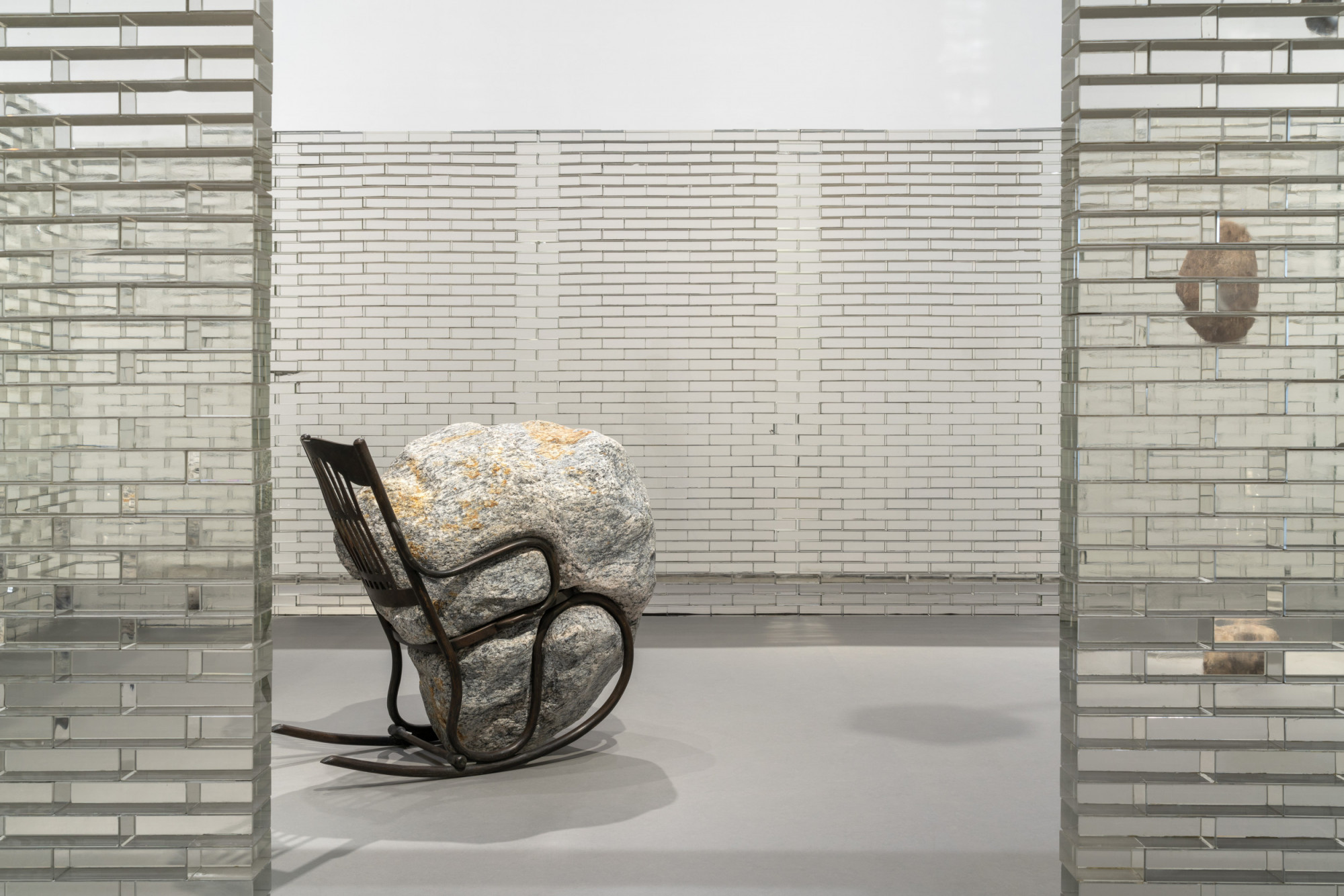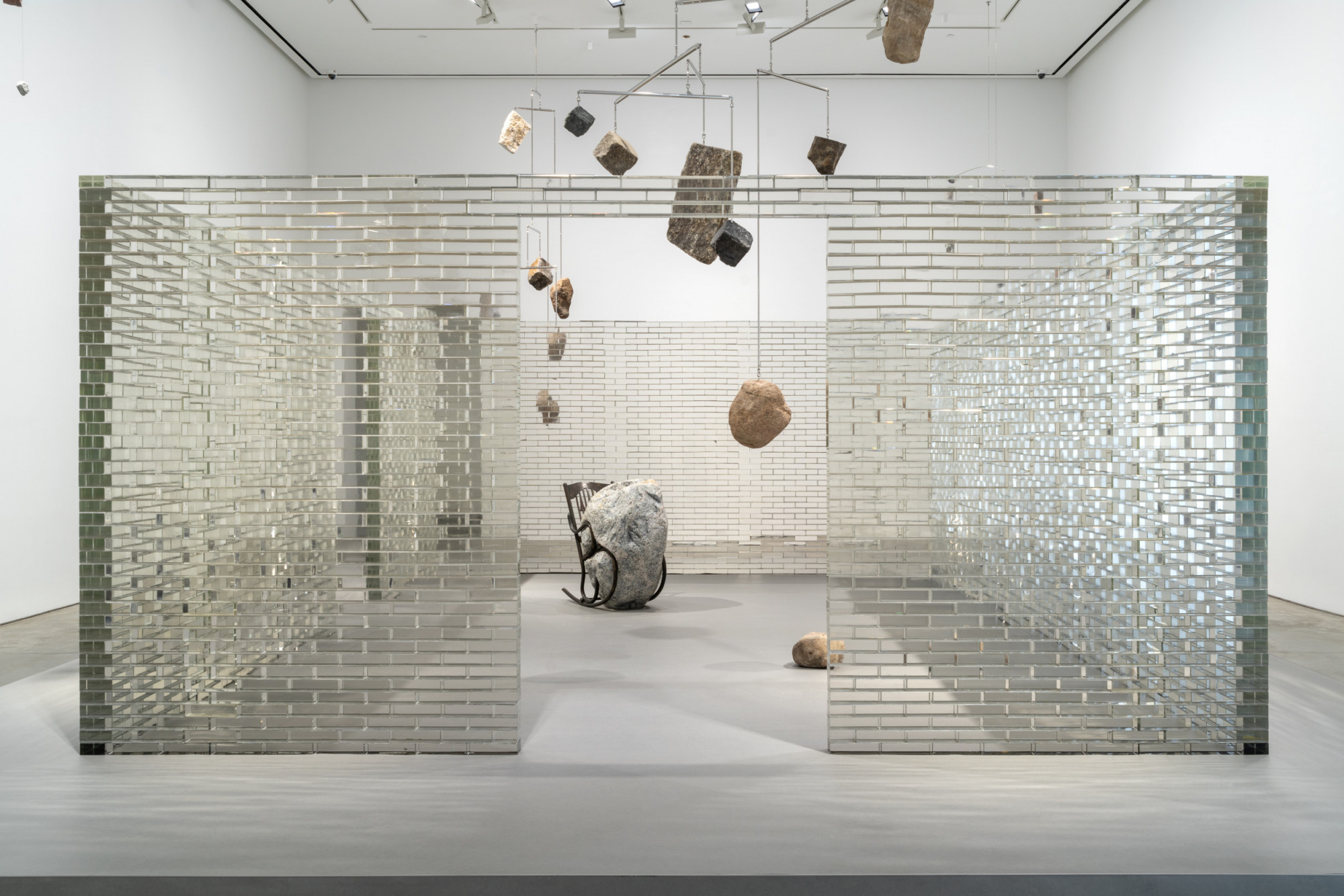 Several mobiles of varying scales float overhead and arise from the floor, their delicate armatures belying the weight they bear. Constellations of natural stones act as symbolic depictions of orbiting planets or particles held in place by unseen forces made visible. At the center of the exhibition lies a new large-scale installation: a replica of a room in the artist’s home constructed of transparent glass brick, creating a limbo space within the gallery for visitors to pass through and observe. Inside, viewers encounter Stella Sella (2022), a bronze cast of a wooden rocking chair bearing a boulder of equal scale. In this scenario, the encumbered chair could be a surrogate for a person, a poignant depiction of anxious anticipation. Looking outward at the numerous mobiles surrounding the ghostly structure produces a sense of foreboding, throwing the delicate tension between glass and stone into sharp relief.