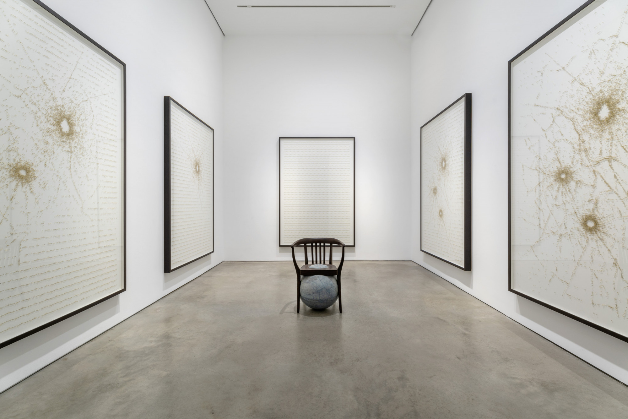 Kwade will also present the latest evolution of her works on cardboard, a series of compositions titled Schusslöcher. Each image is comprised of 8,760 watch hands, one year measured in hours. Viewed in sequence, they depict a descent from chronological order into chaos as the organizational logic of an unfurling timeline is overwritten to suggest bullet holes and their outward rippling impact pattern. Evocative of the natural tendency of systems towards entropy, the works speak to a subjective experience of time, defined by events of magnitude and unpredictability.