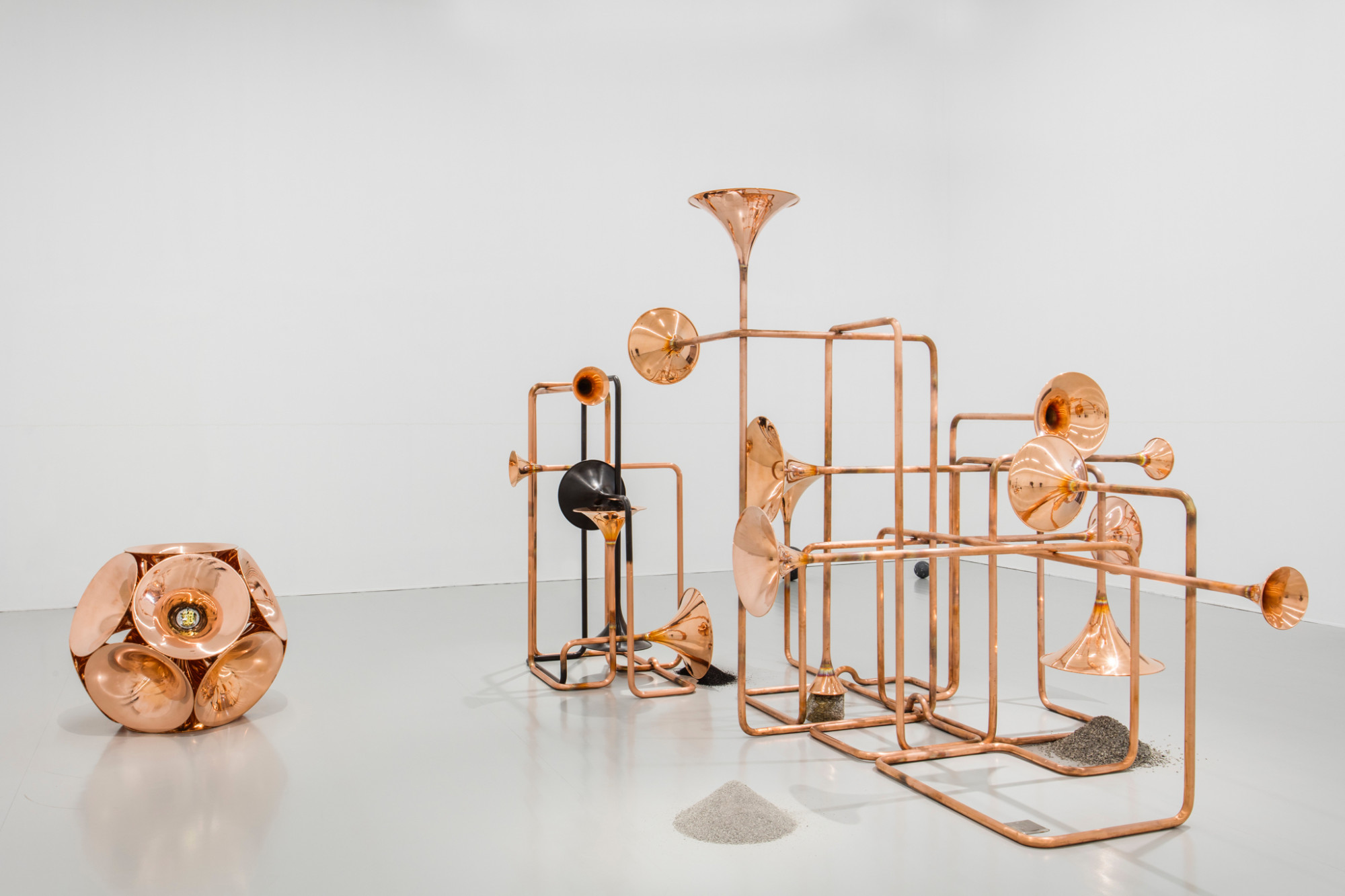 The gallery displays a few horn-shaped sculptures, the wide-flared mouths of which are interconnected with slender tubes. This series of works, Hypothetical Figure, originates from the concept of wormhole in modern science – the universe may have cramped tunnels that link different time and space. Kwade connects horn holes and tubes, and places granite in the upward-facing mouths and detritus of equivalent weight under the downward facing mouths, so as to construct a metaphor that a matter processed by the wormhole ends up in a different status despite the same mass – the result of a journey in space-time. Kwade questions not only the earth but also the abstruse relations of time and space. To explore those undefined mysteries, she establishes a distinctive visual system to approach the answers and hews out a novel path for visions.