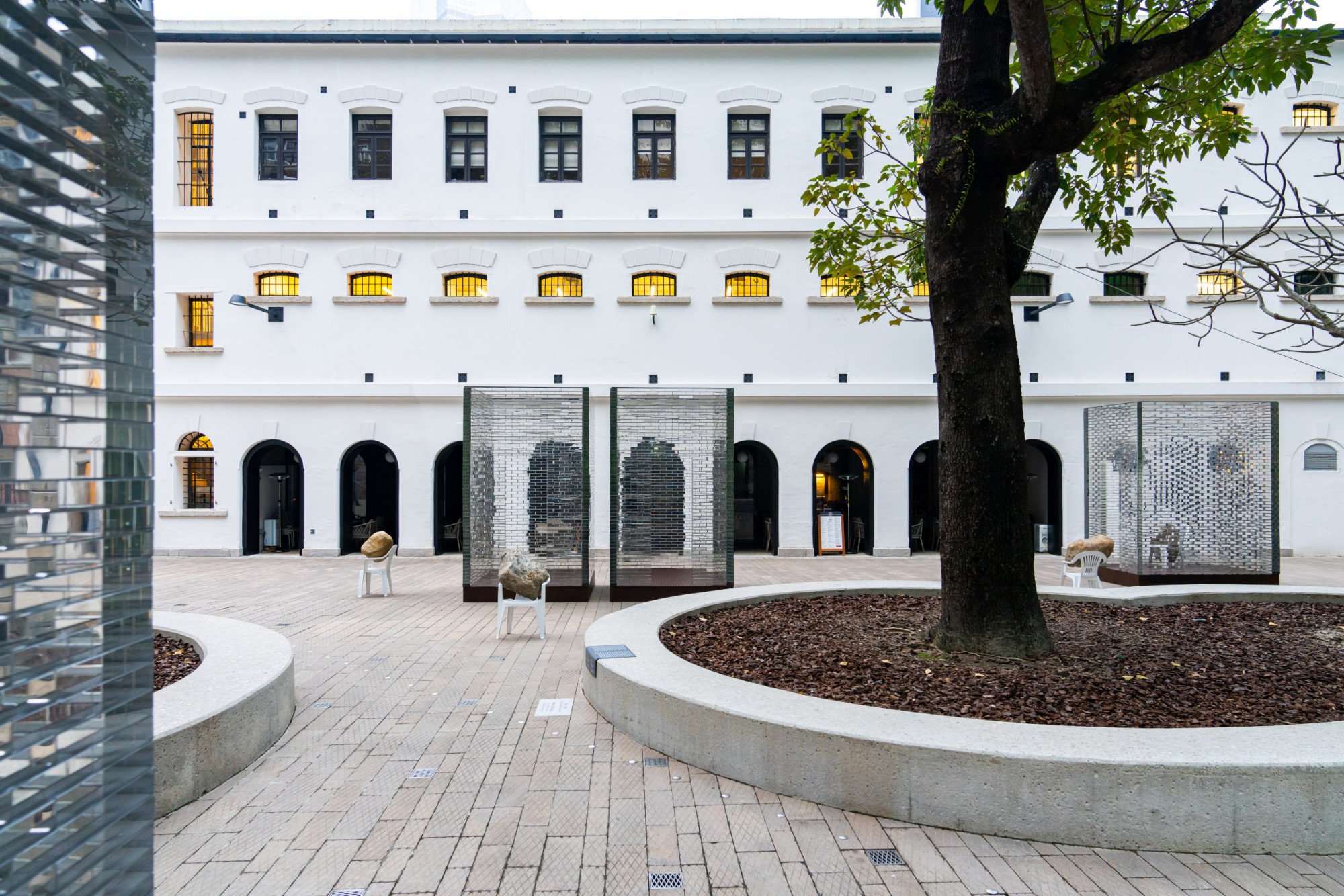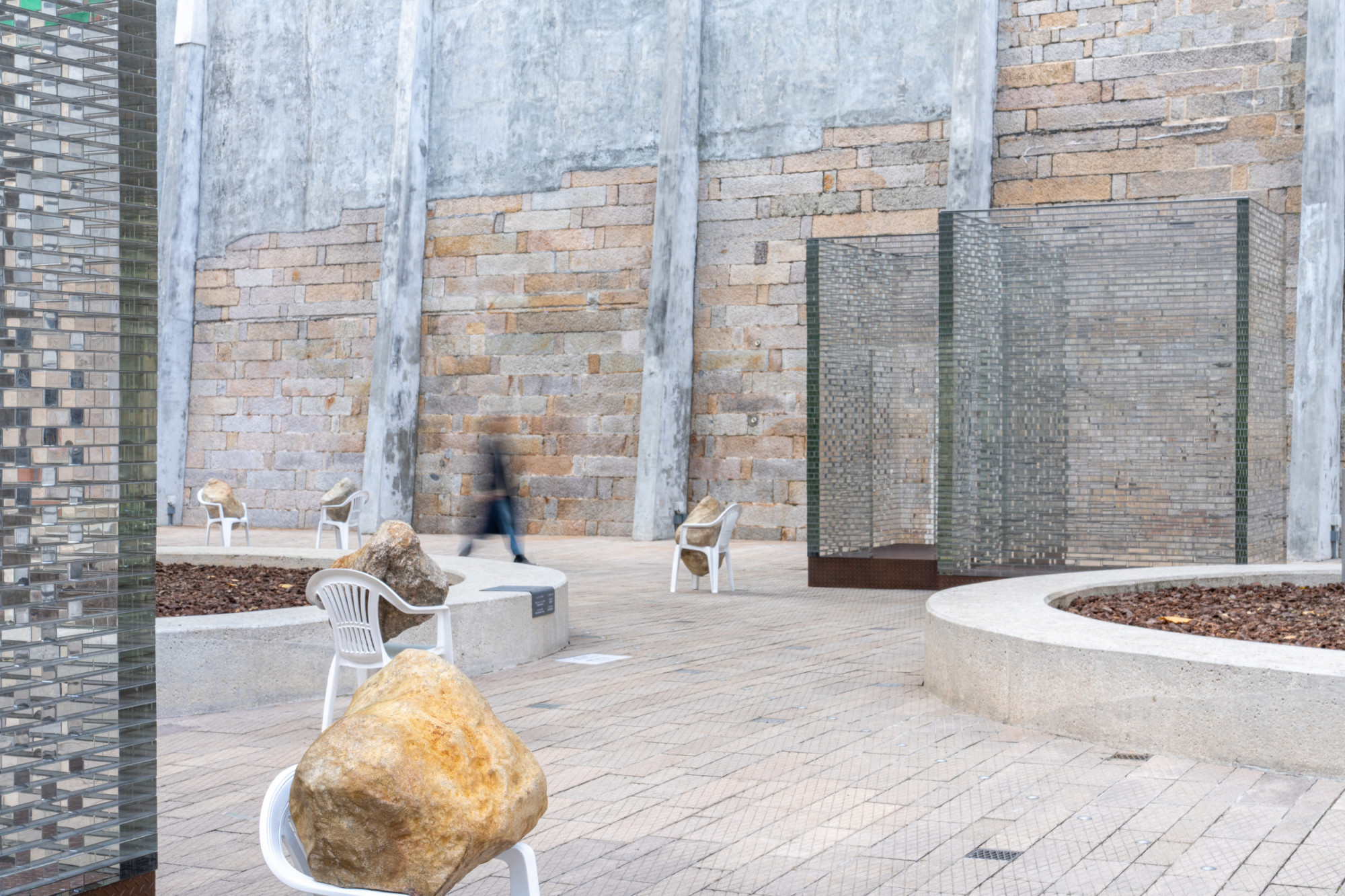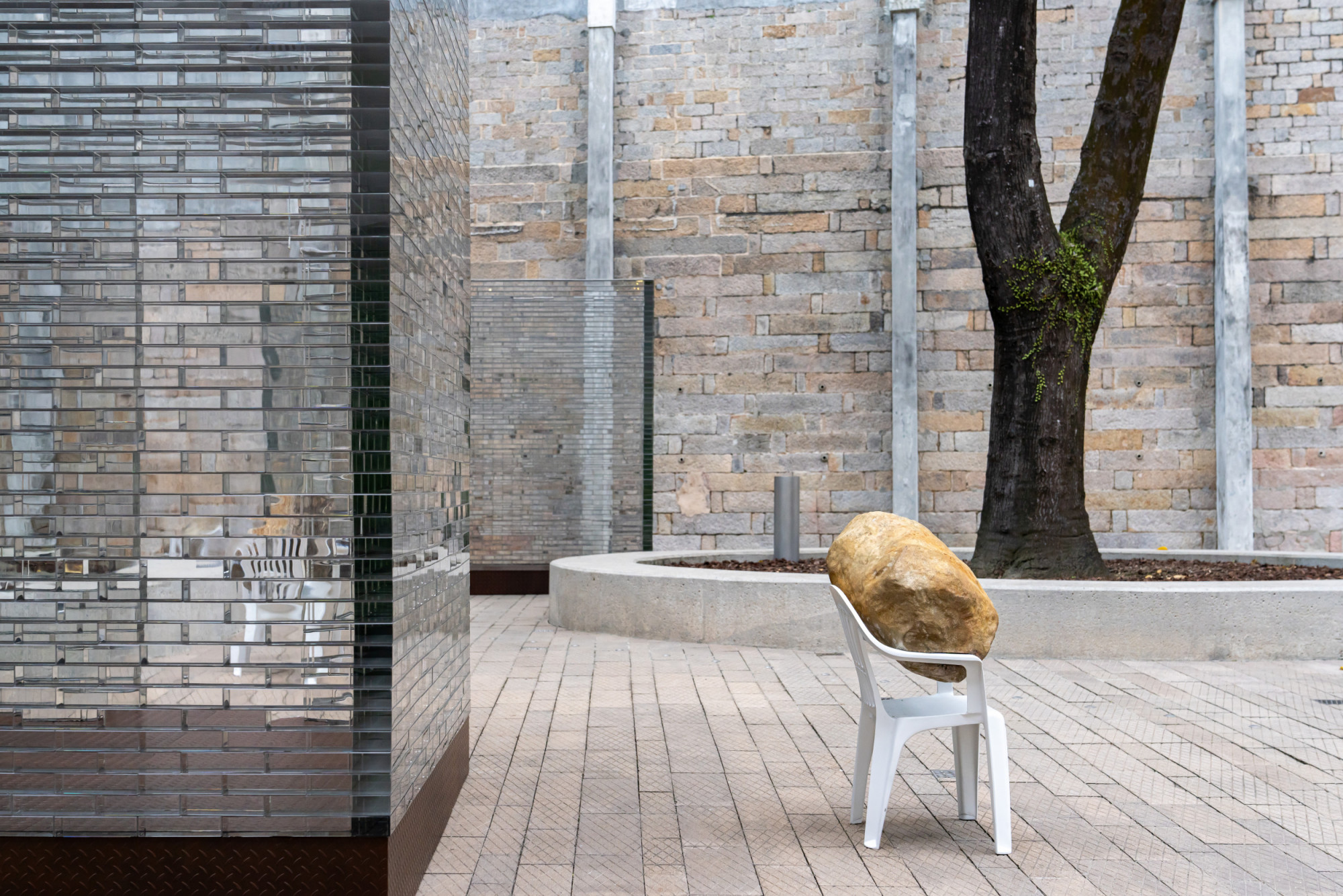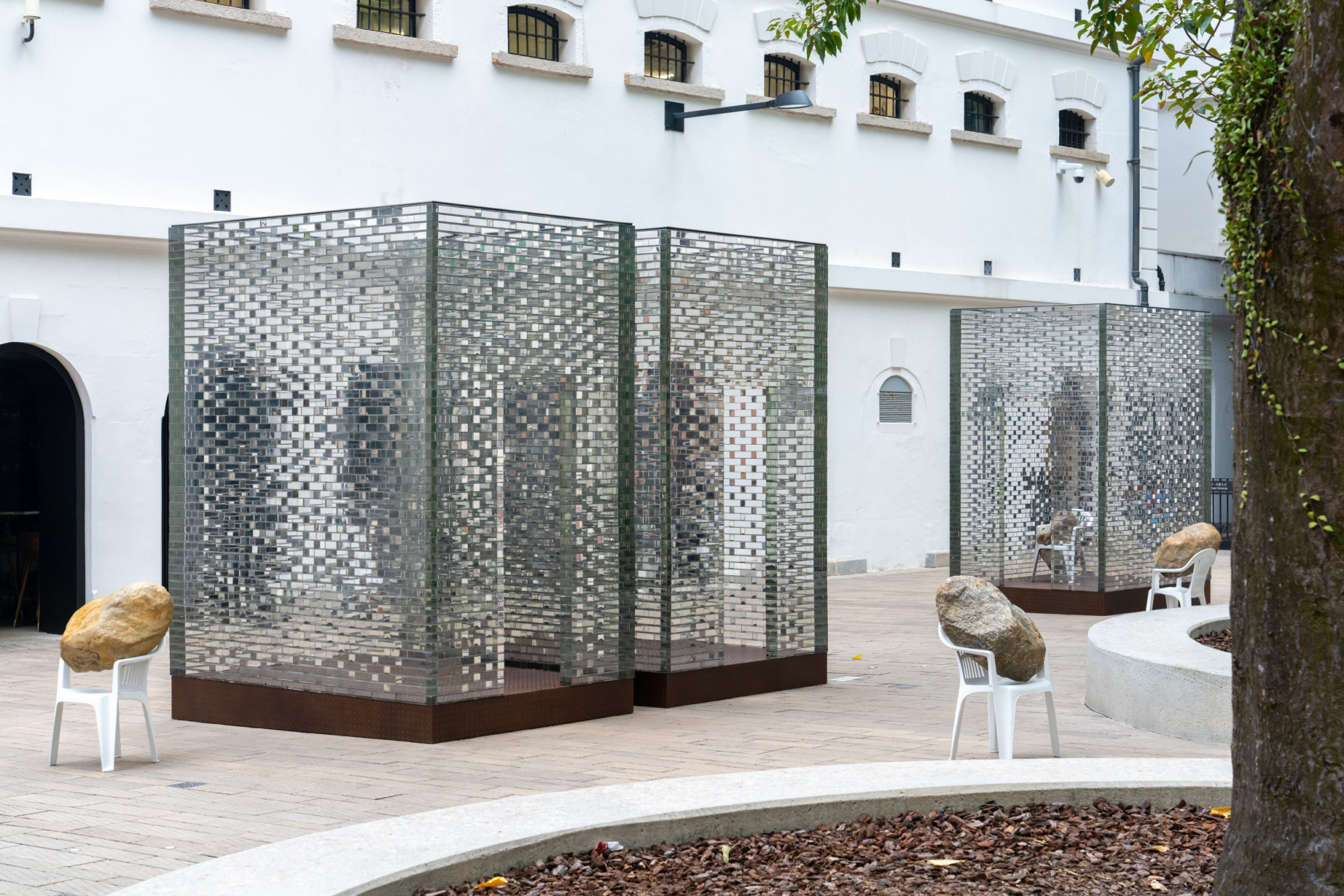 The installation includes six glass structures that correspond to a group of eight bronze casted Monobloc chairs, each in a dynamic interaction with a boulder—the boulders seem almost to be falling through the chairs, creating an unexpected power dynamic between these objects. Identical replicas, the stones present a natural element manifested as eight identical and mirrored forms. As such, they call to mind both an object and the various possibilities for existing in the present. Alicja Kwade created this installation after learning the history of Tai Kwun’s Prison Yard, including the fact that prisoners would experience punishments, inspections, assemblies, and group exercises here at different times, first of all they spend their time waiting in those cells. In a contemporary context, individuals at the Prison Yard are waiting for an appointment, an event, or a decision. Waiting Pavilions thus reflects Kwade’s thoughts on “waiting as punishment” in our contemporary lives. The size and construction of the glass structures mirror the prison cells in the nearby B and D Halls. They hint at the invisible barriers in our everyday lives. Kwade’s works frequently feature chairs to represent human presence. Here, each white chair bears the weight of a stone differently, which can be understood as a metaphor for how each of us handles our burdens.