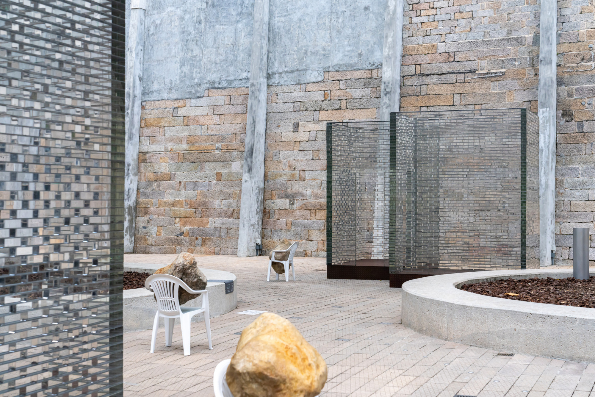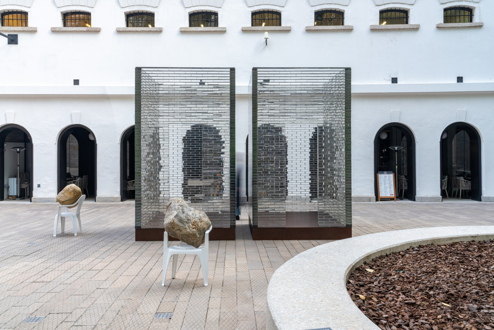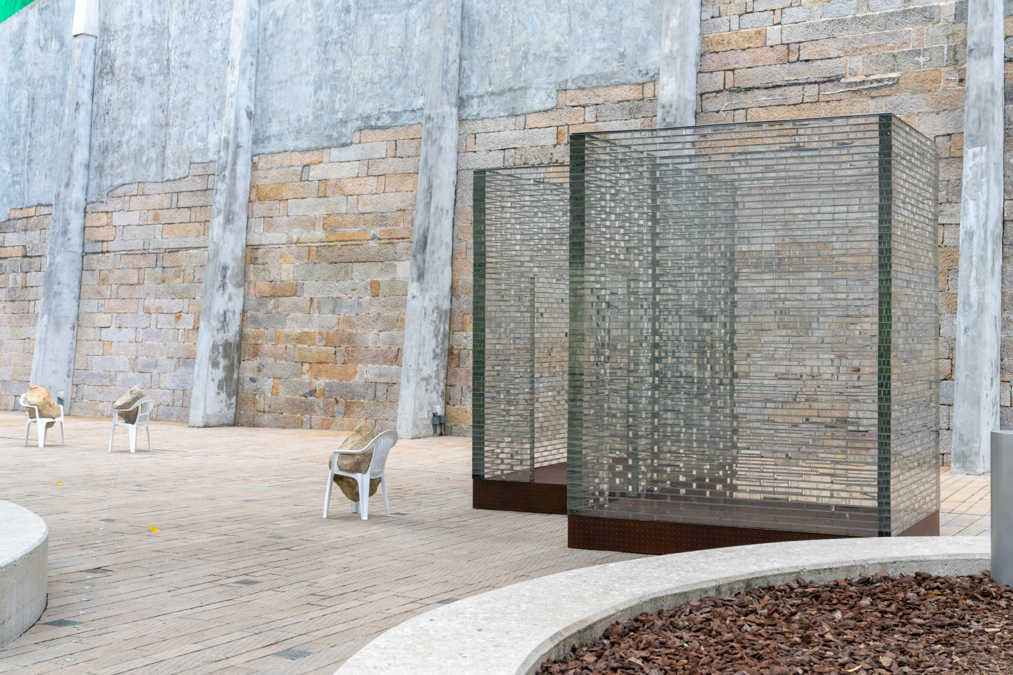 The installation includes six glass structures that correspond to a group of eight bronze casted Monobloc chairs, each in a dynamic interaction with a boulder—the boulders seem almost to be falling through the chairs, creating an unexpected power dynamic between these objects. Identical replicas, the stones present a natural element manifested as eight identical and mirrored forms. As such, they call to mind both an object and the various possibilities for existing in the present. Alicja Kwade created this installation after learning the history of Tai Kwun’s Prison Yard, including the fact that prisoners would experience punishments, inspections, assemblies, and group exercises here at different times, first of all they spend their time waiting in those cells. In a contemporary context, individuals at the Prison Yard are waiting for an appointment, an event, or a decision. Waiting Pavilions thus reflects Kwade’s thoughts on “waiting as punishment” in our contemporary lives. The size and construction of the glass structures mirror the prison cells in the nearby B and D Halls. They hint at the invisible barriers in our everyday lives. Kwade’s works frequently feature chairs to represent human presence. Here, each white chair bears the weight of a stone differently, which can be understood as a metaphor for how each of us handles our burdens.
