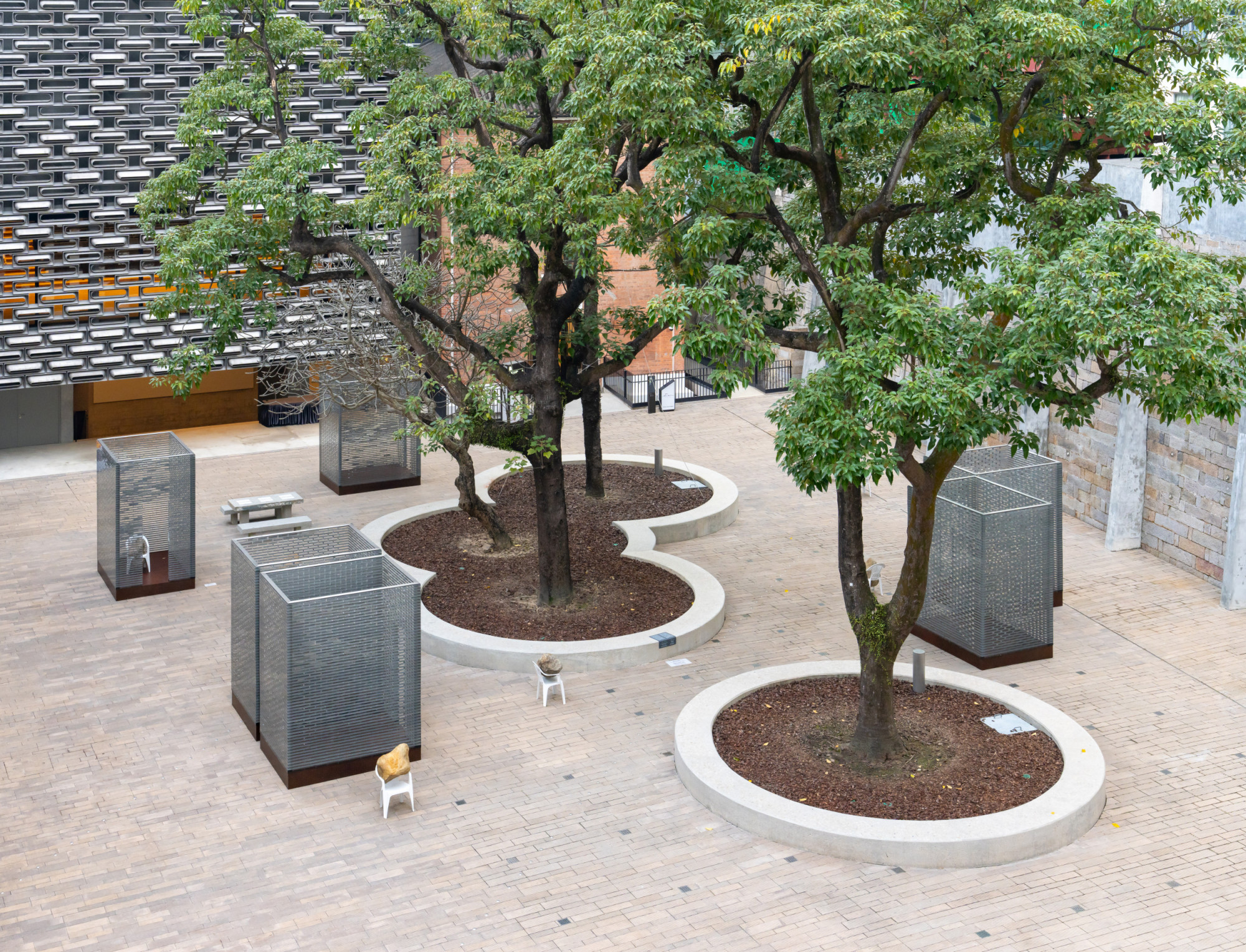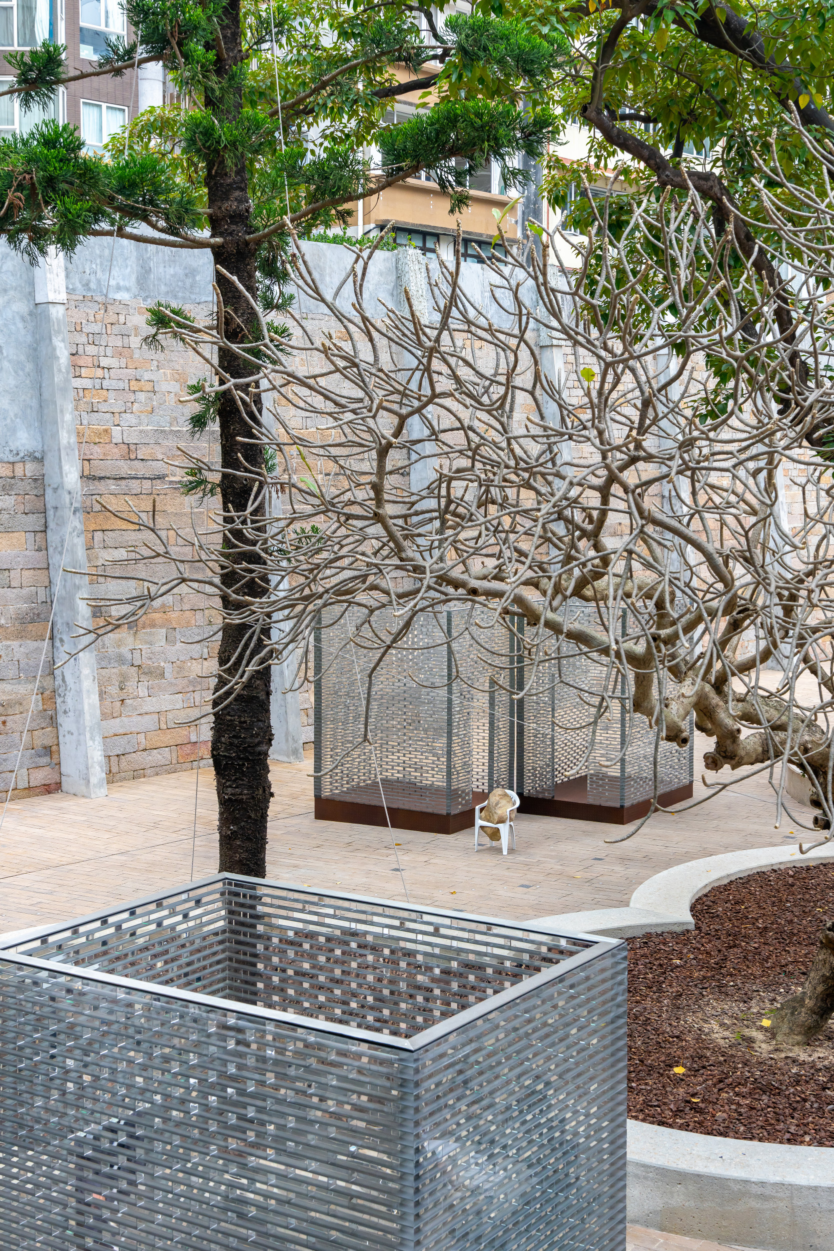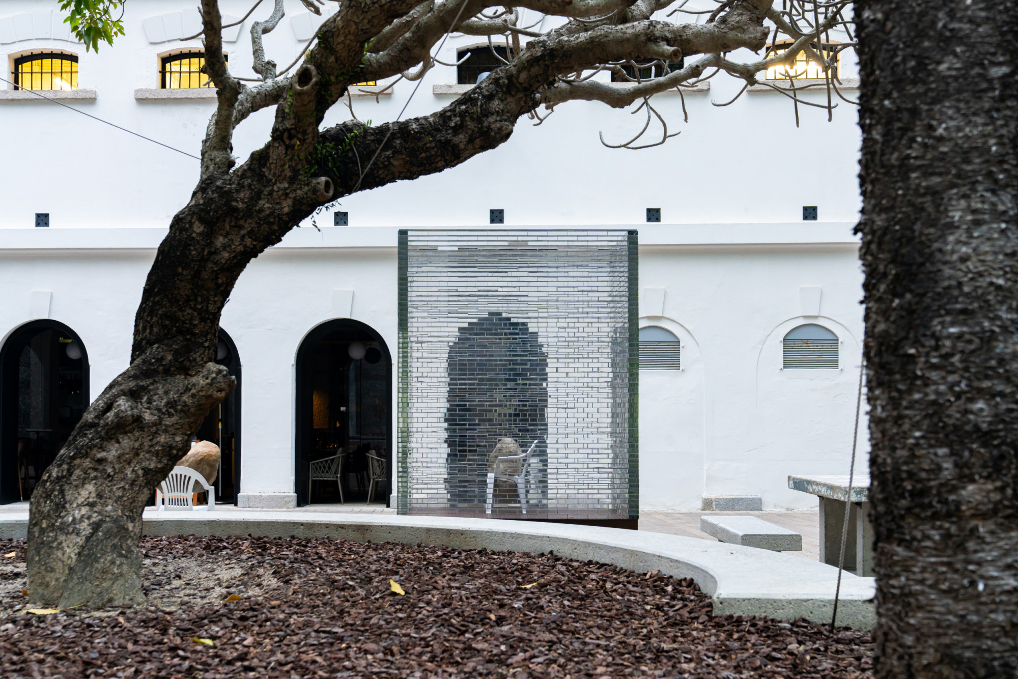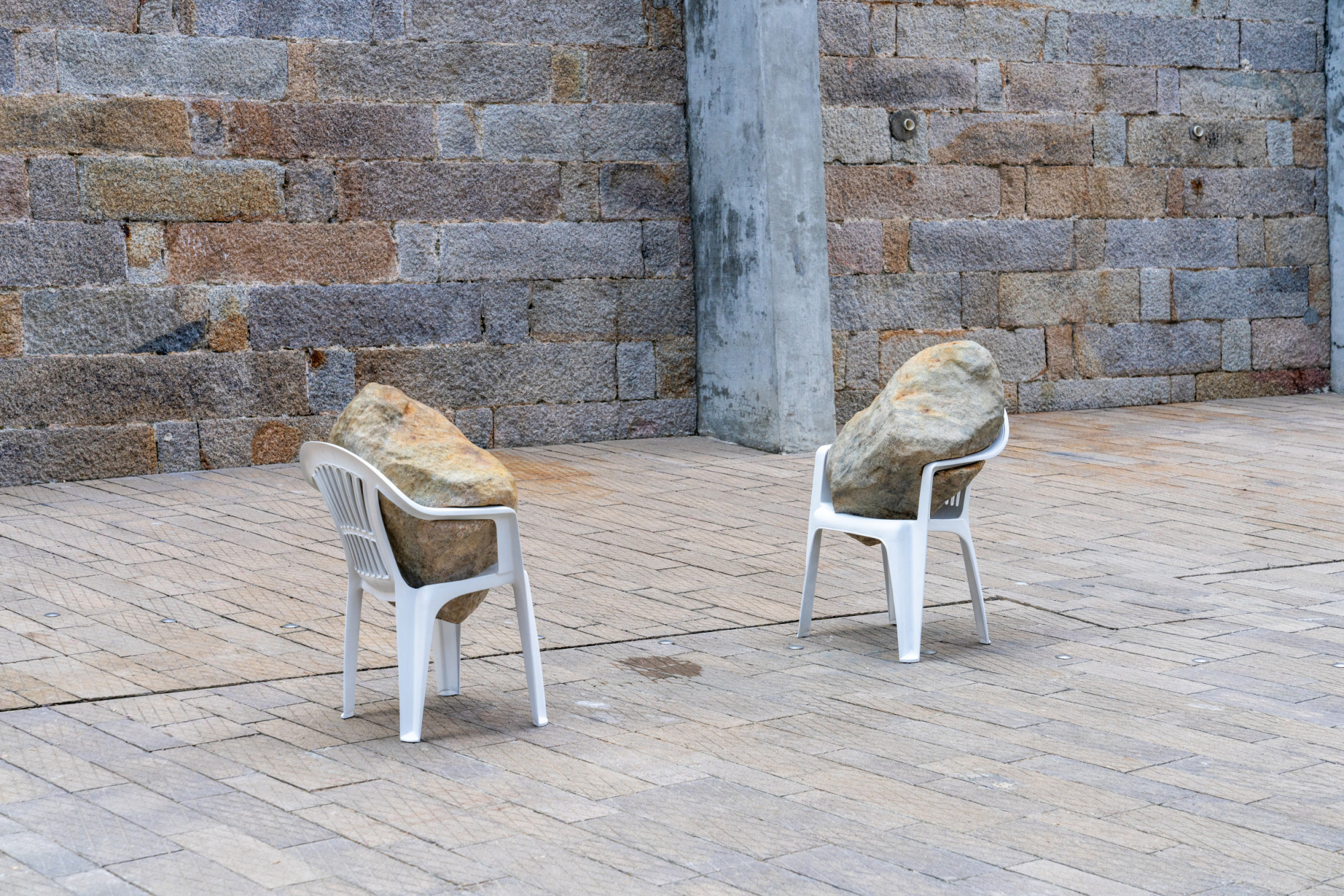 The installation includes six glass structures that correspond to a group of eight bronze casted Monobloc chairs, each in a dynamic interaction with a boulder—the boulders seem almost to be falling through the chairs, creating an unexpected power dynamic between these objects. Identical replicas, the stones present a natural element manifested as eight identical and mirrored forms. As such, they call to mind both an object and the various possibilities for existing in the present. Alicja Kwade created this installation after learning the history of Tai Kwun’s Prison Yard, including the fact that prisoners would experience punishments, inspections, assemblies, and group exercises here at different times, first of all they spend their time waiting in those cells. In a contemporary context, individuals at the Prison Yard are waiting for an appointment, an event, or a decision. Waiting Pavilions thus reflects Kwade’s thoughts on “waiting as punishment” in our contemporary lives. The size and construction of the glass structures mirror the prison cells in the nearby B and D Halls. They hint at the invisible barriers in our everyday lives. Kwade’s works frequently feature chairs to represent human presence. Here, each white chair bears the weight of a stone differently, which can be understood as a metaphor for how each of us handles our burdens.