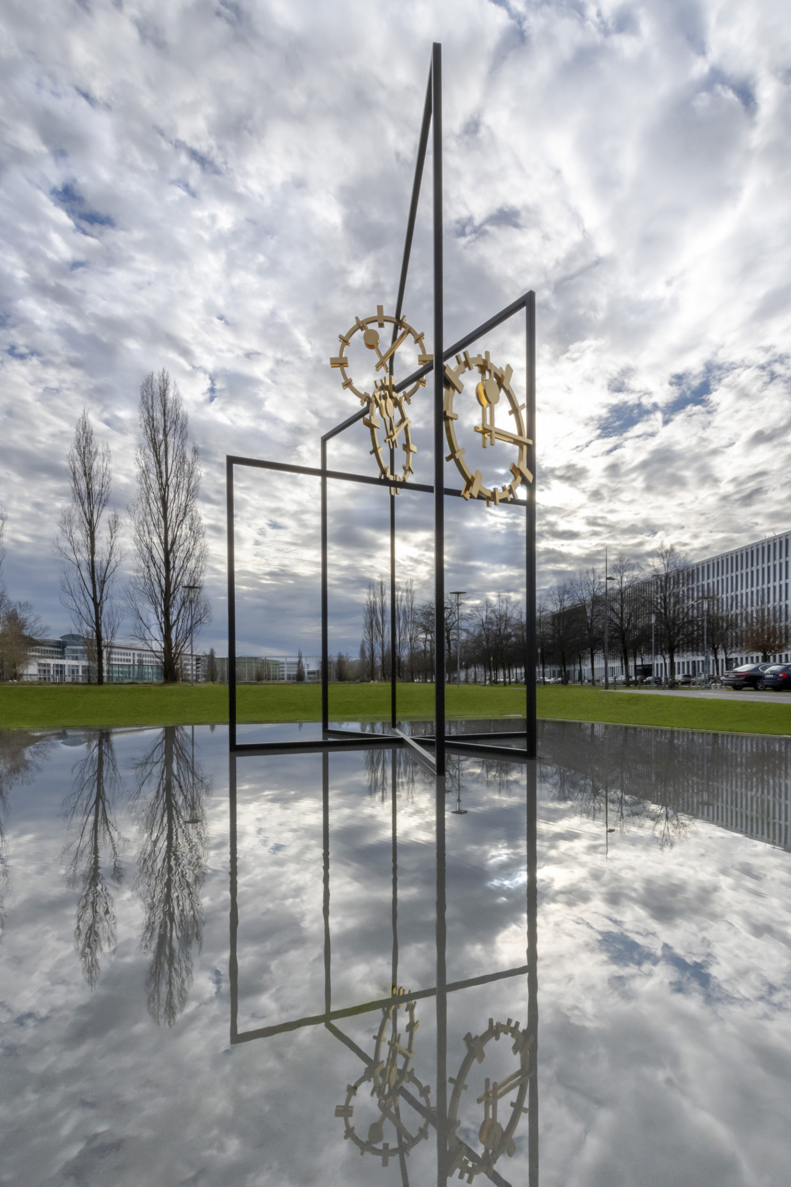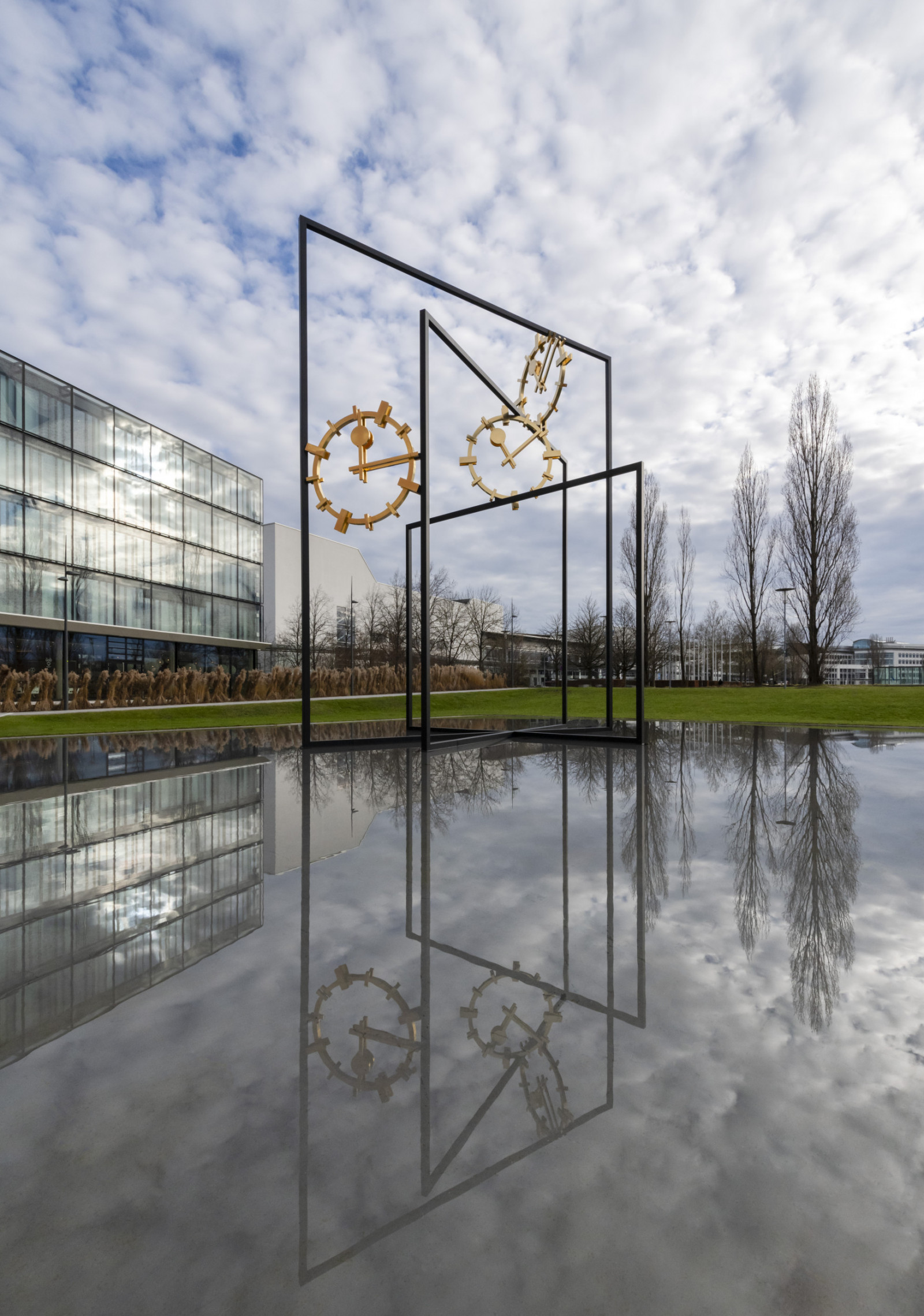 The inspiration for the work is, on the one hand, Arie Katzenstein's sacrifice and, on the other, the location itself. The movement consists of three nested frames that are connected by three clocks. The design of the clocks is based on the clock that was located at the airport tower, which now houses the Brainlab headquarters in front of which the memorial will stand.