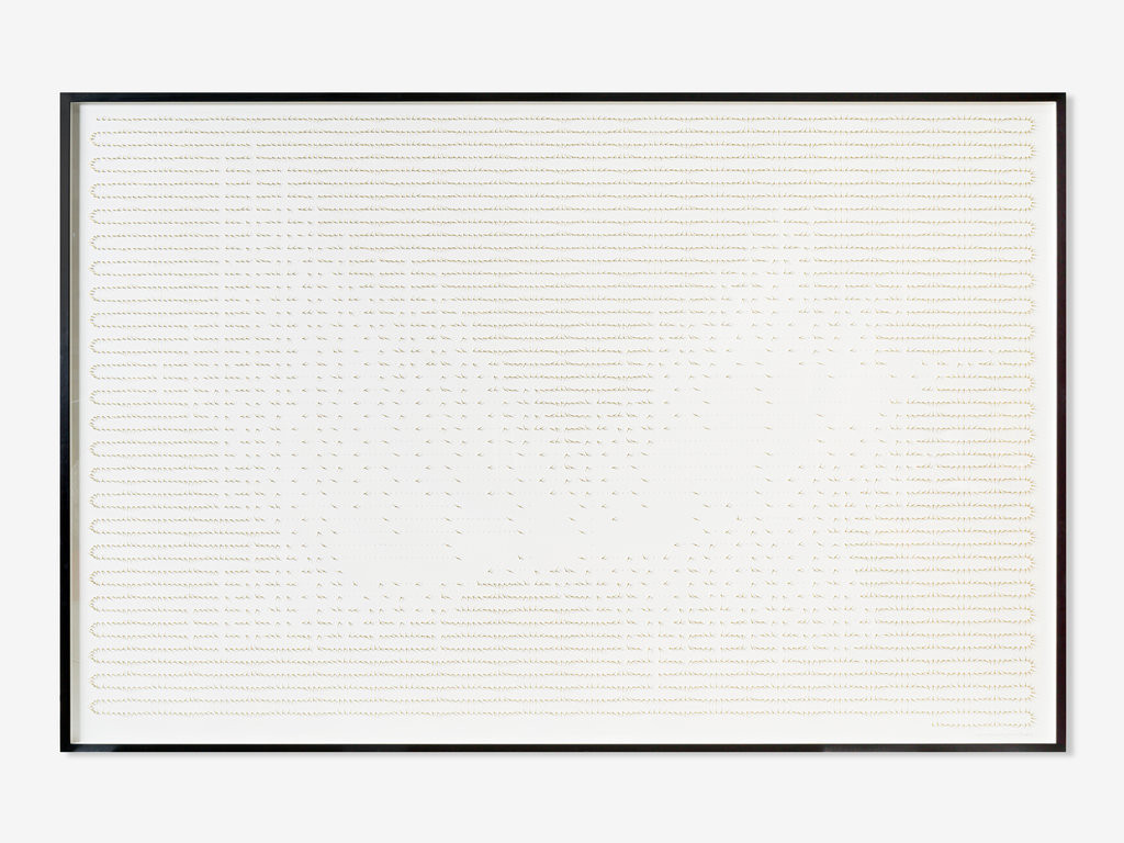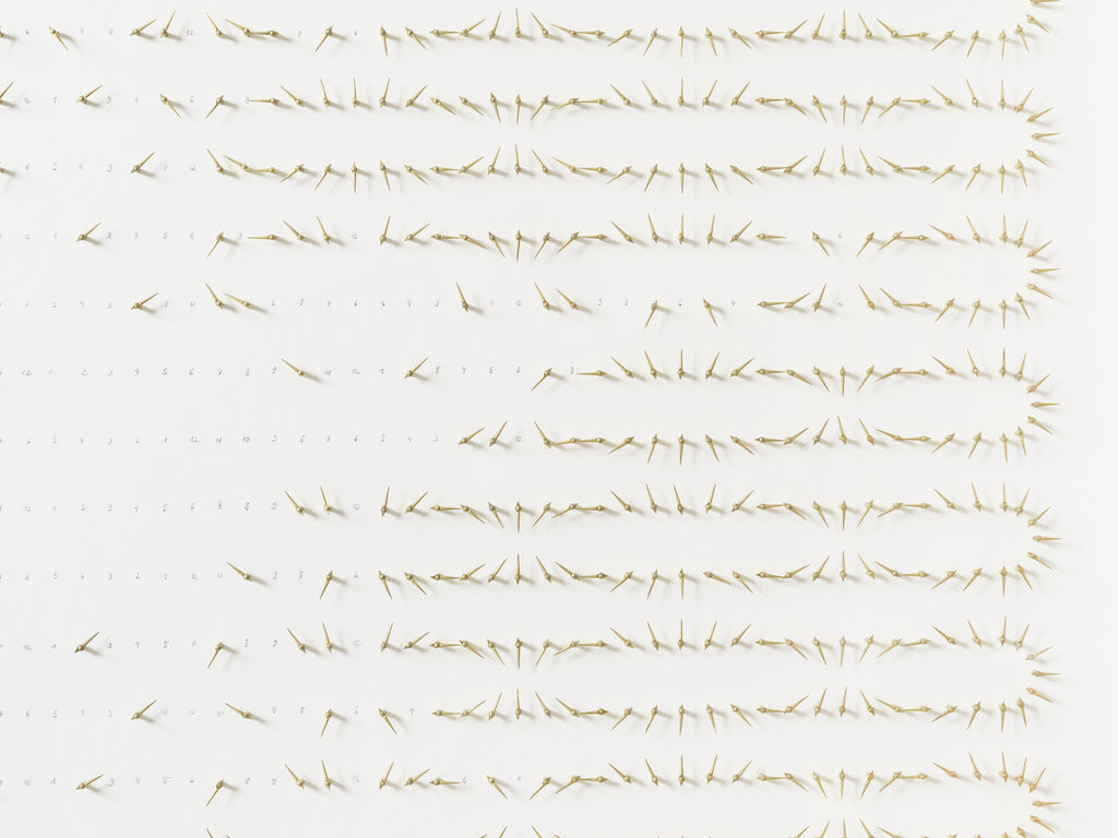 The amount of hours of one year are visualized through a sequential arrangement of brass clock hands. This arrangement creates a rhythmic and undulating pattern, reminiscent of the graphical depiction of waves in both light and sound. In "A year and 95 missing days (2280 hours)", Alicja Kwade deliberately withholds certain clock hands to evoke a poignant reminder of the elusive and irretrievable moments lost to the relentless passage of time.
