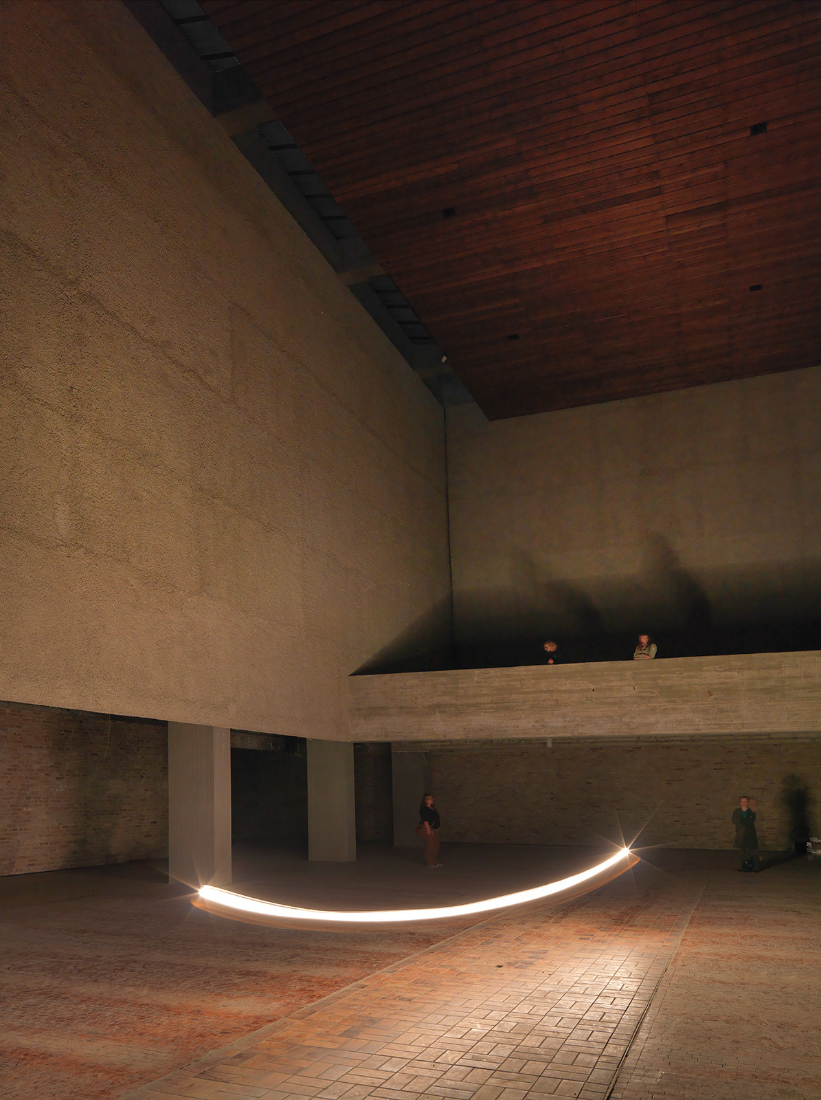Alicja Kwade transforms the church space of St. Agnes in Berlin into a sound- and light-installation that is based on the Foucault pendulum. The Foucault pendulum is named after the French physicist Léon Foucault. It’s a simple device conceived to demonstrate the rotation of the Earth in an easy-to-see experiment. Alicja Kwade placed this experiment in the exhibition space and instead of using the original lead bob she hung a light bulb. Thus, the dark space is illuminated by only one light source and each swing is amplified by a sound system.