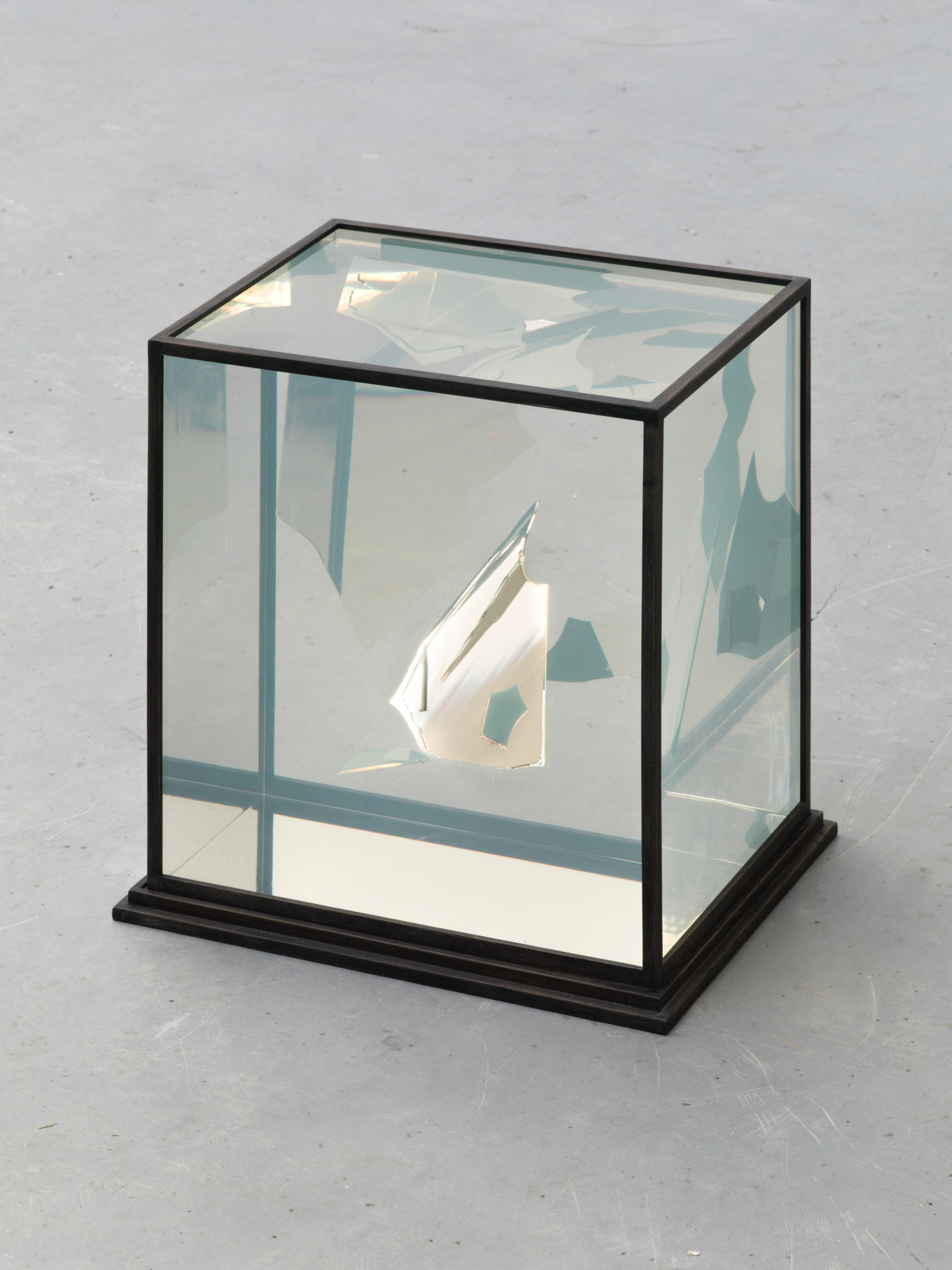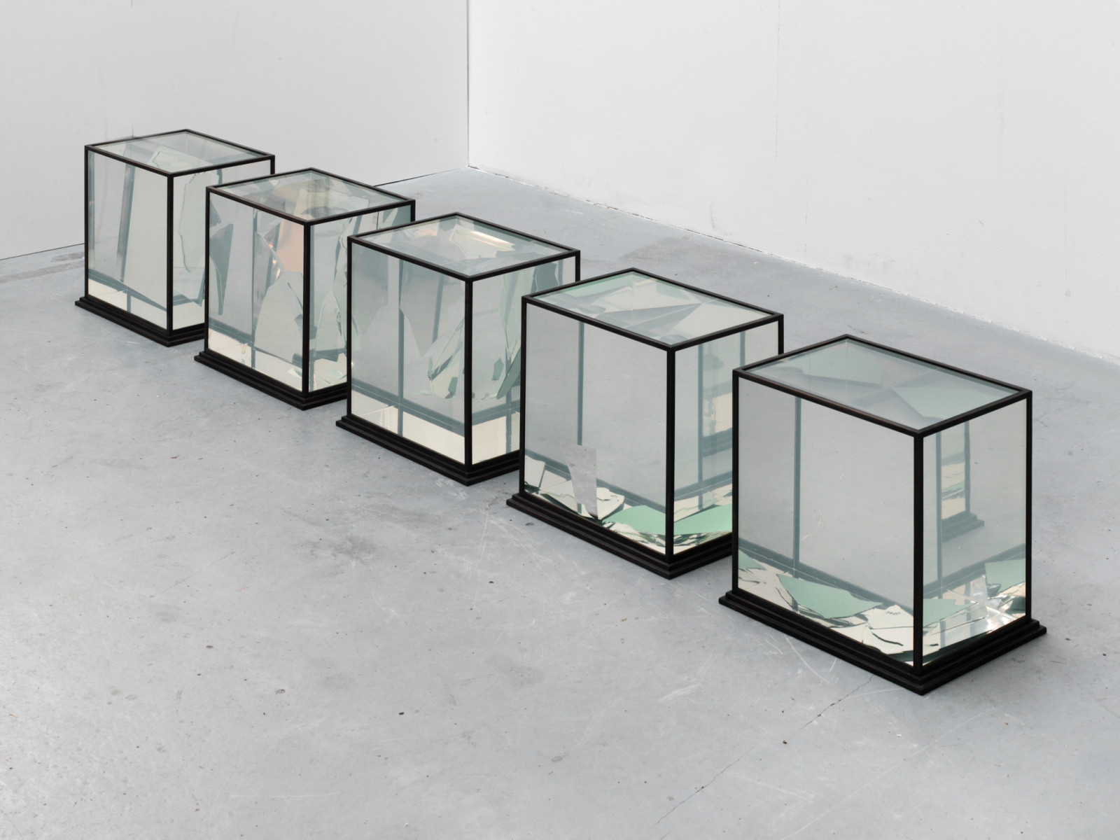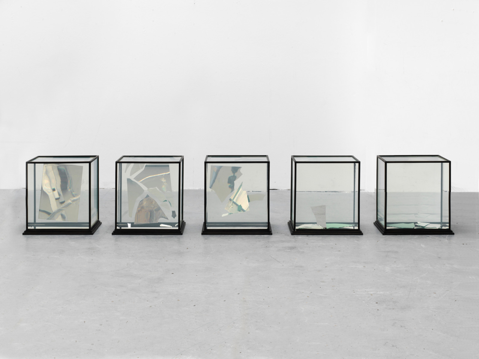 „Space Slot“ observes a mirror while falling down and breaking accidentally into many shards, until they all lie scattered on the floor. The work is showing the very moment of this physical action, as if frozen in time: In five states by repeating the exact same shape of the accidentally formed shards. Limited to the size of the square which works here as a slot in reality: everything out of it disappears - like into a different dimension.