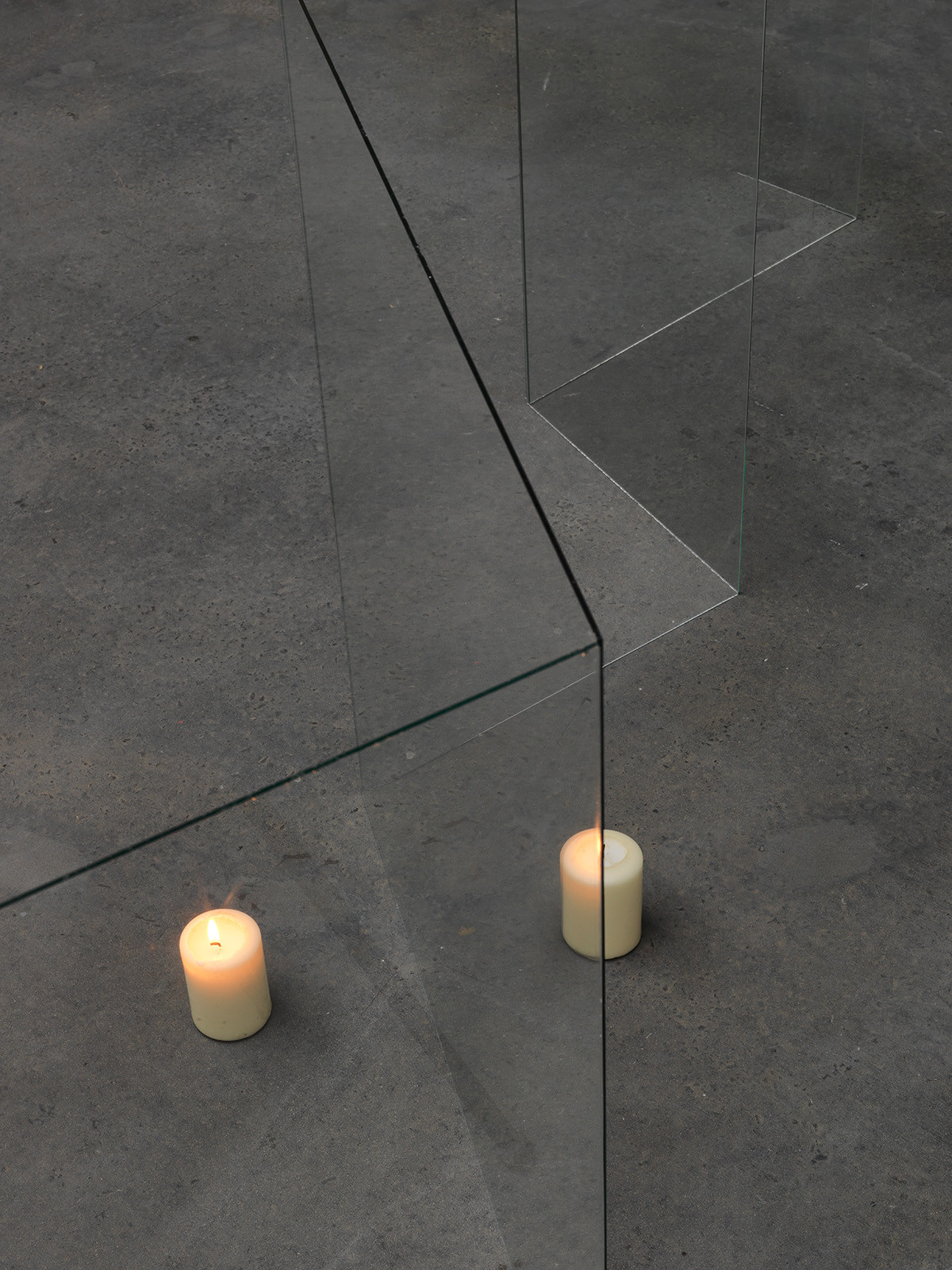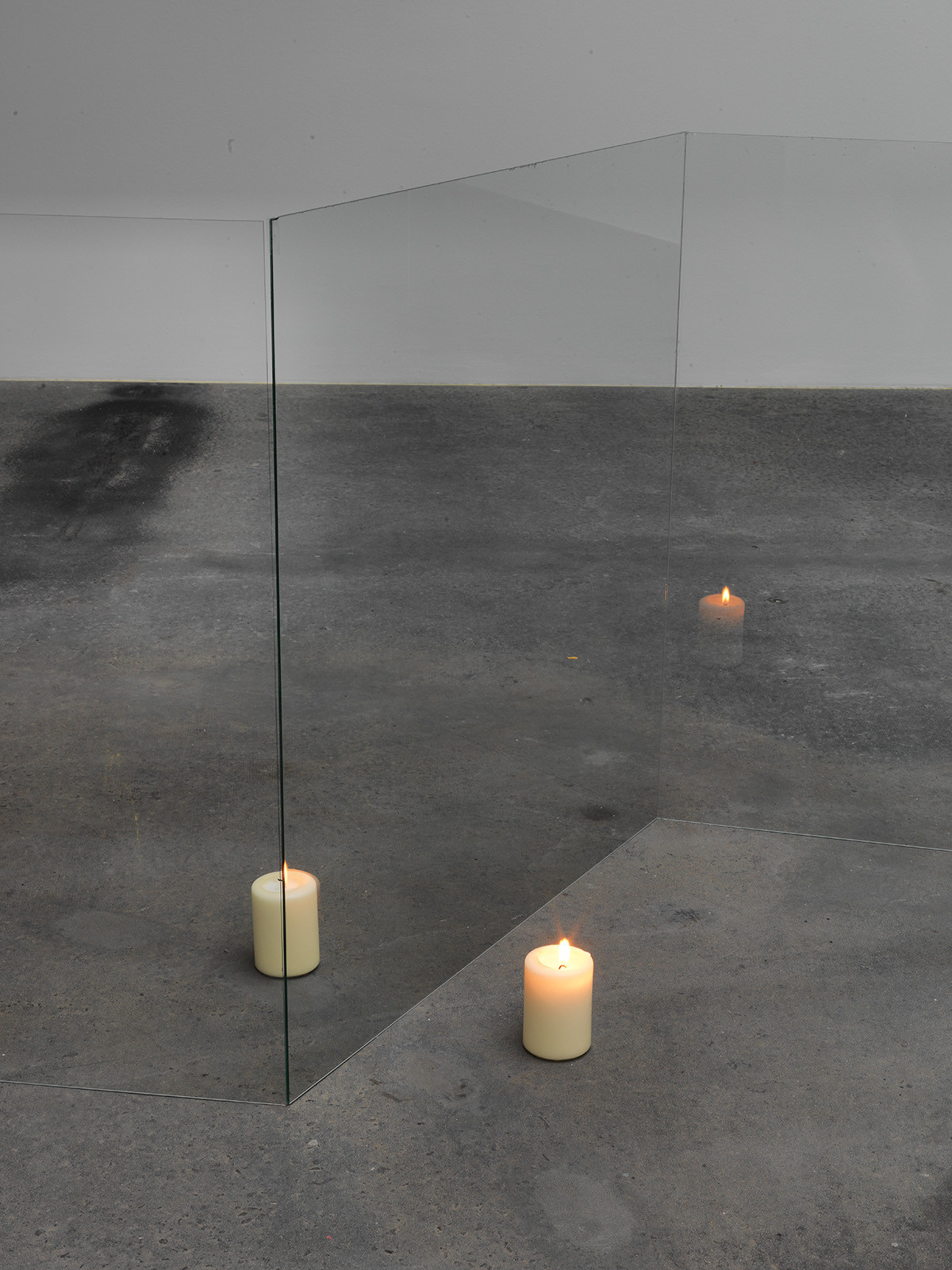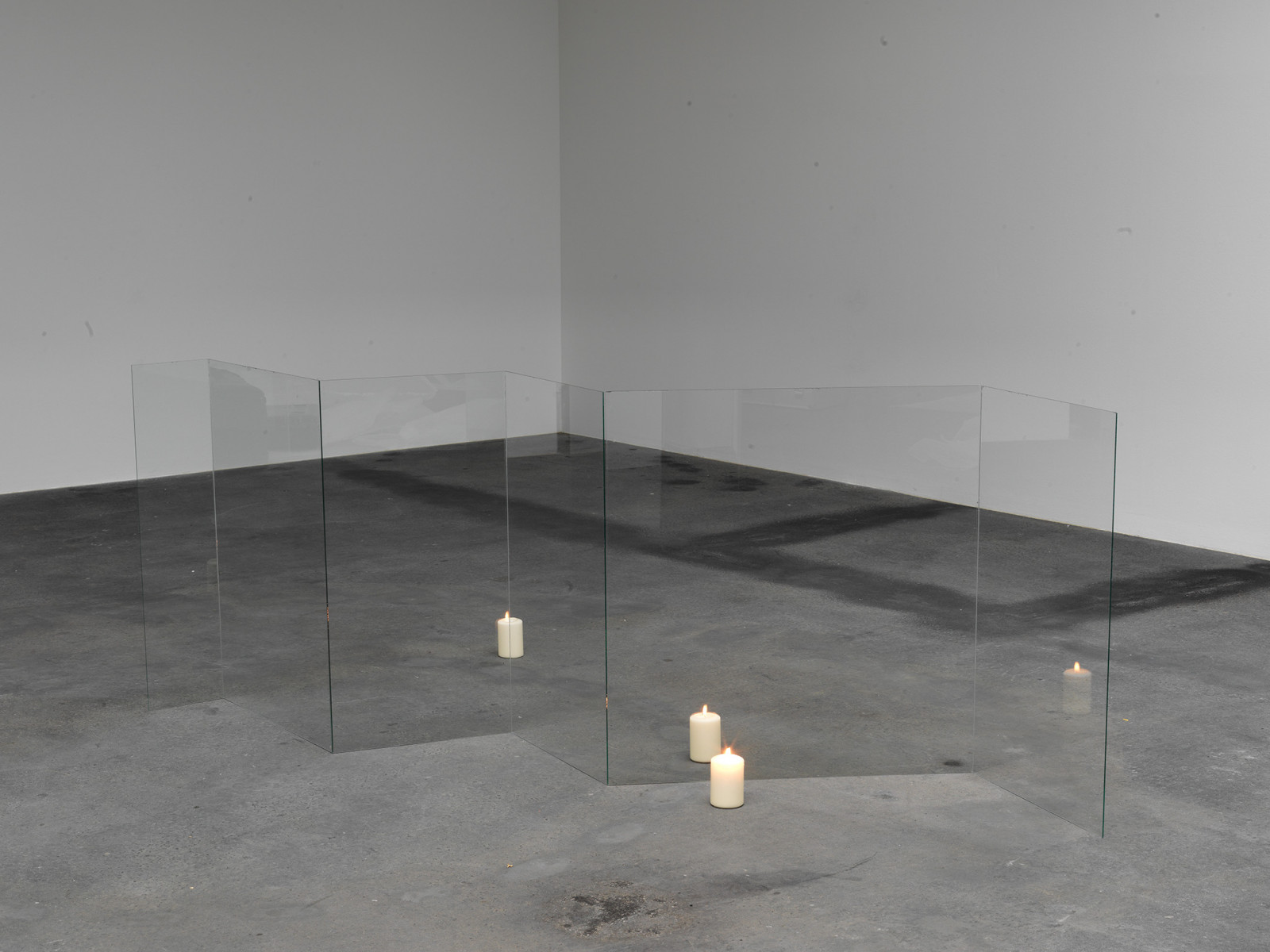 In this work the light of an object is transported by the reflection in the glass to the next object. The situation changes depending on the viewer's position; sometimes the object seems to glow, then only half so, then to be turned off completely.