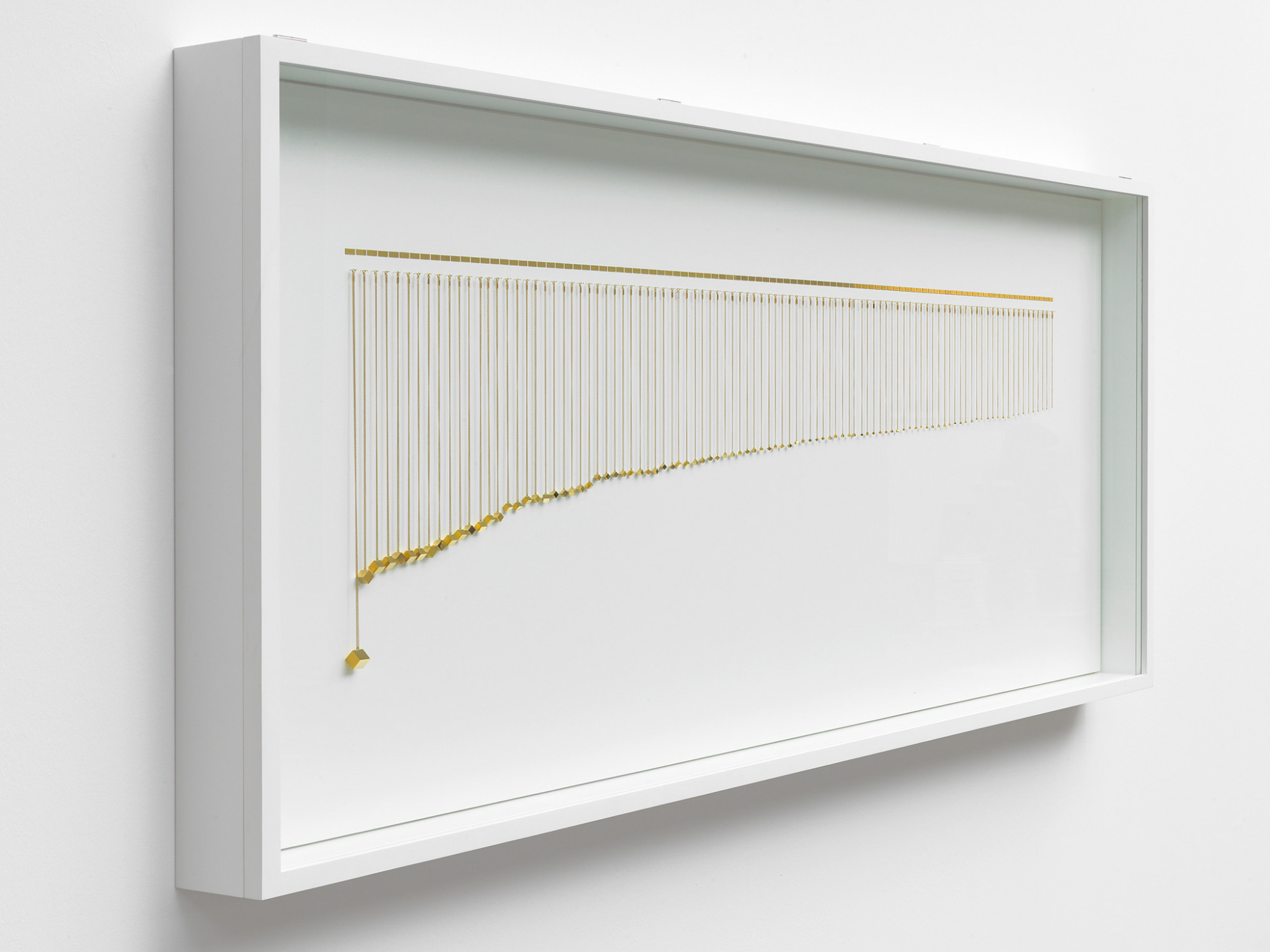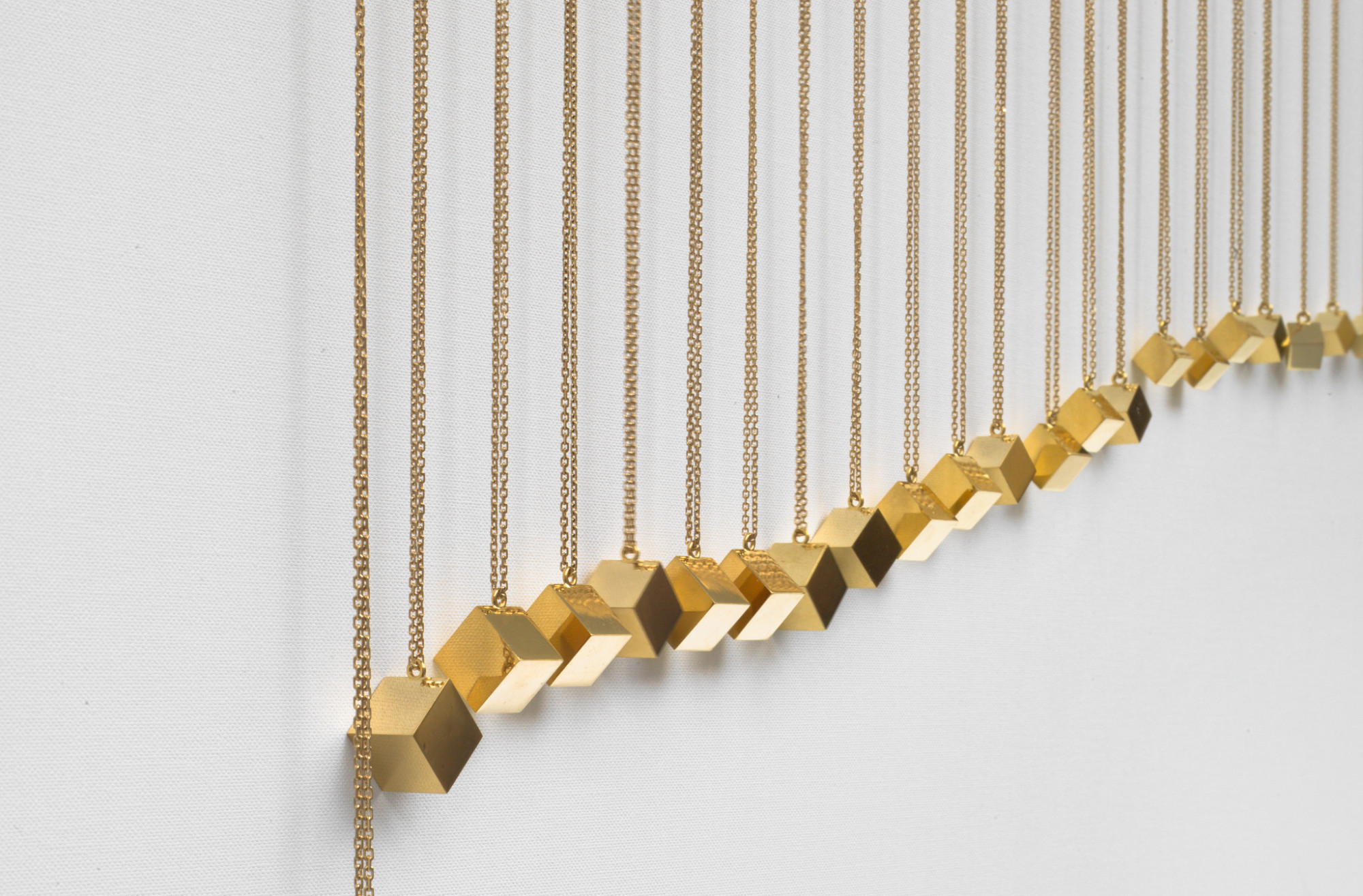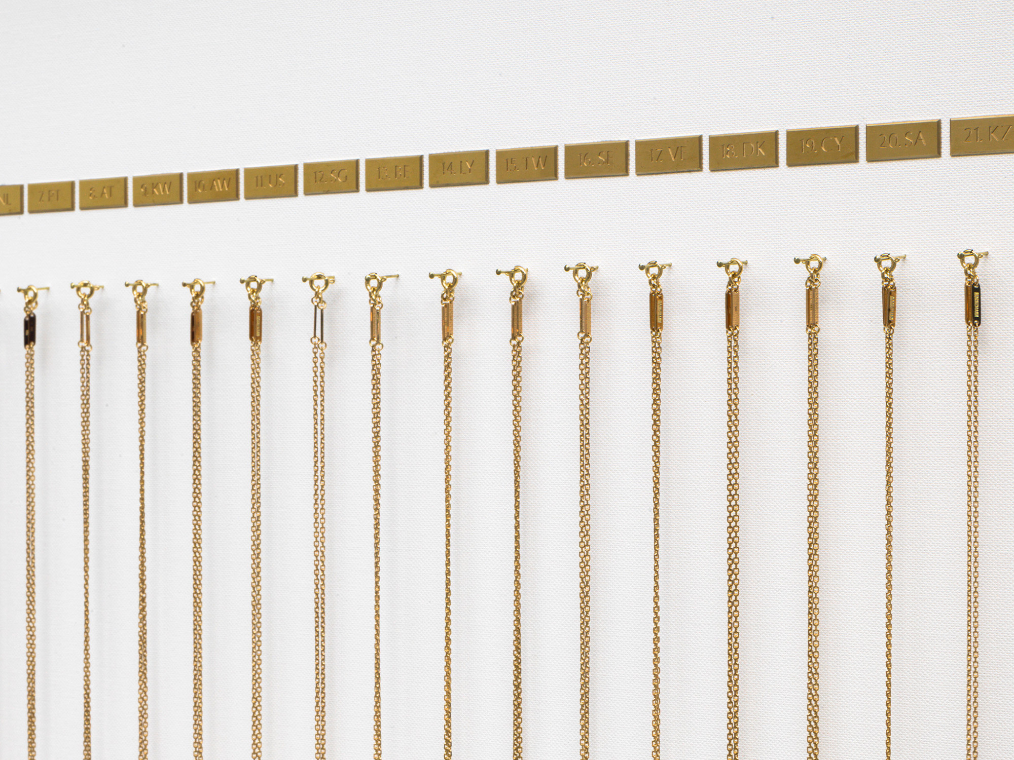 GoldVolks is about the gold reserves every country keeps as security for its citizens in times of economic crisis, war or famine. Each gold reserve of 97 countries are officially known. Based on those amounts divided through the population of each country, Alicja Kwade created 97 necklaces out of solid gold. Depending on the reserve, every pendant has a different size. This way the theoretical ownership of gold of each inhabitant becomes visible. During the course of the performance, some necklaces will be worn by a citizen of their country, while others will be shown in a display case. GoldVolks is realized in cooperation with goldsmith's atelier Georg Hornemann.